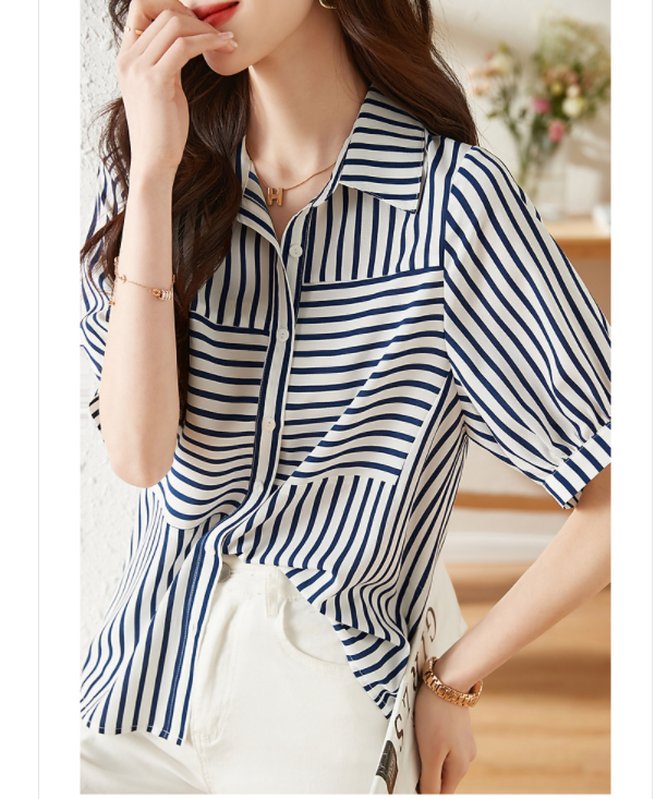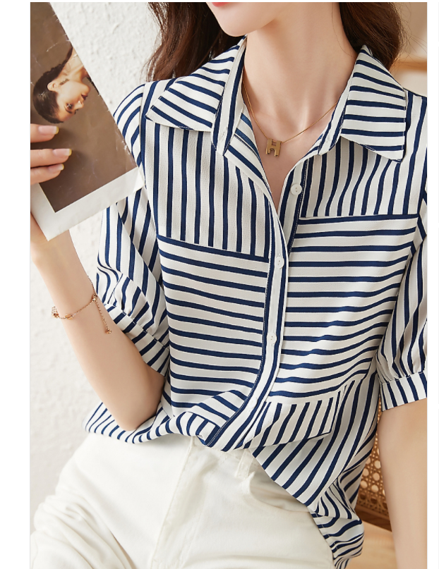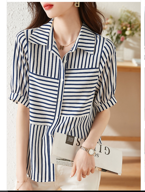 RM5690#夏季通勤舒适透气宽松遮肉显瘦百搭条纹短袖衬衣女