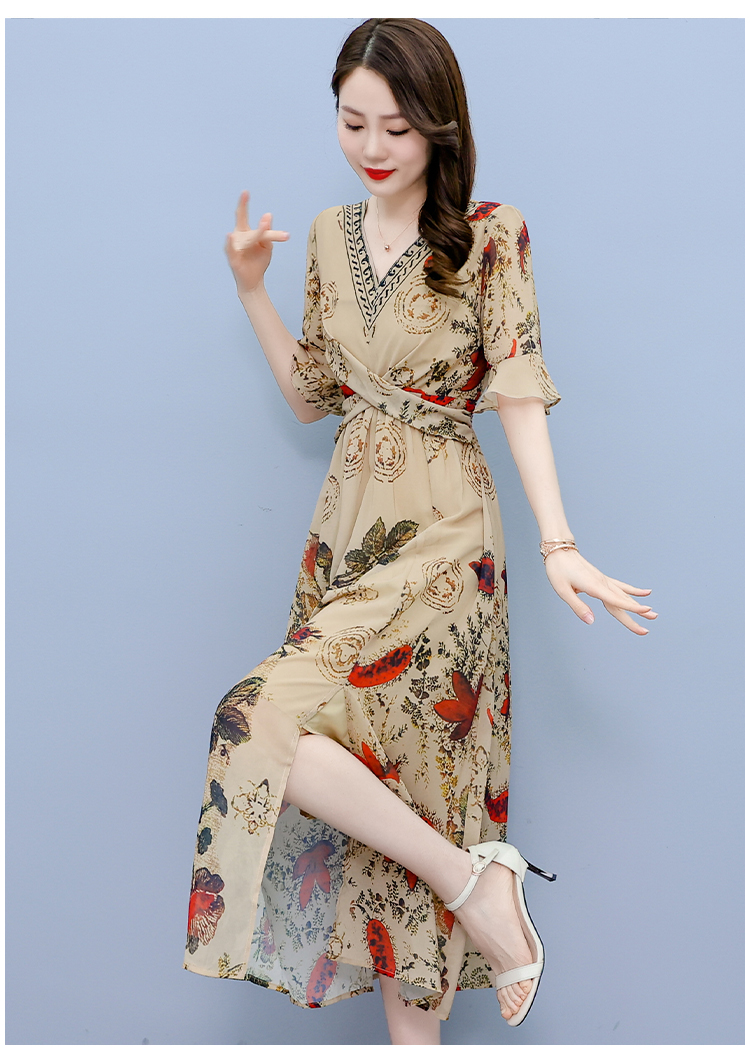RM6376#夏季新款气质V领荷叶边袖口收腰印花雪纺连衣裙女