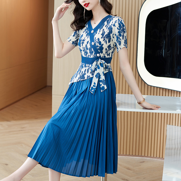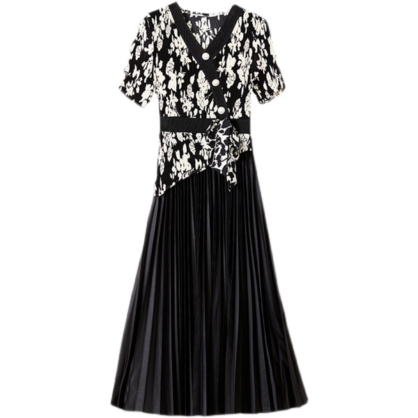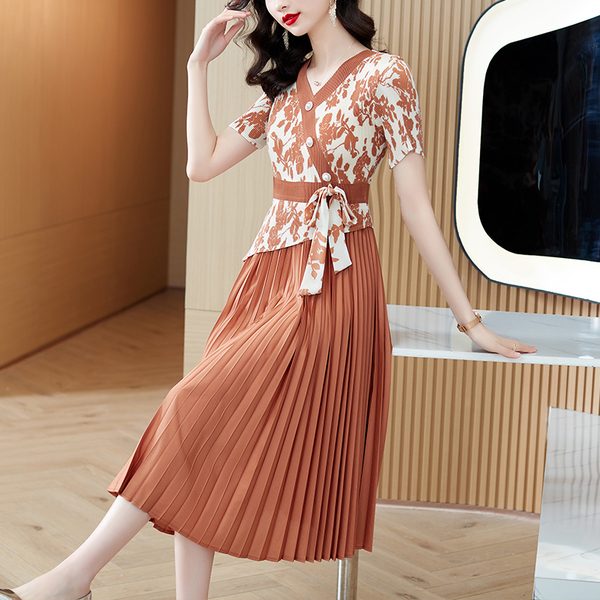 RM6404#三宅褶皱连衣裙2022夏季新款大码印花v领拼接气质显瘦年轻妈妈裙