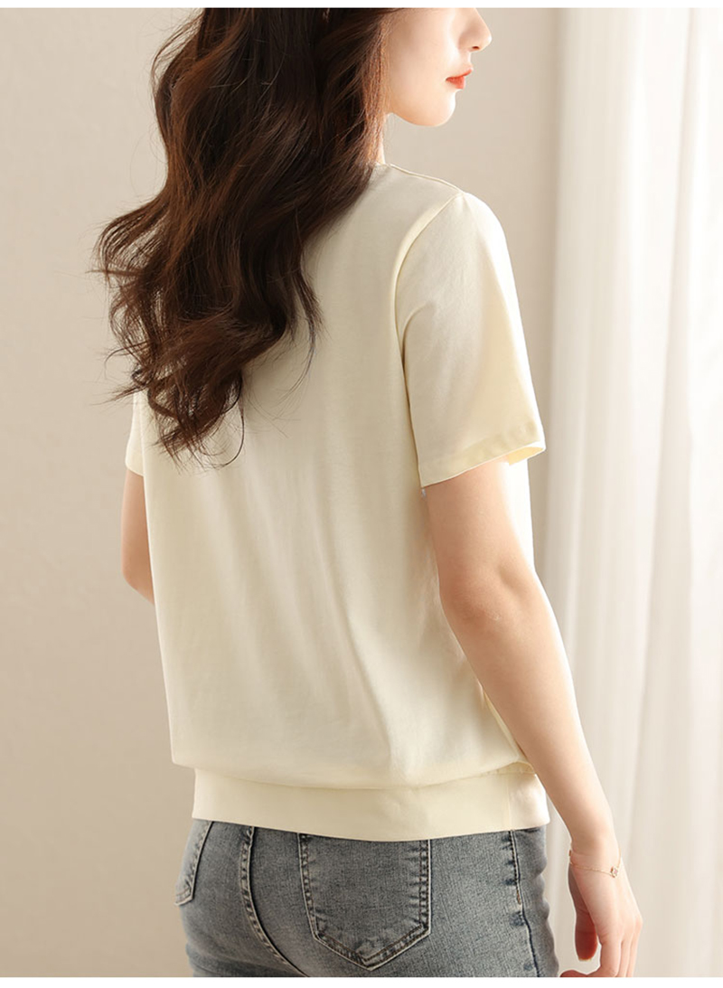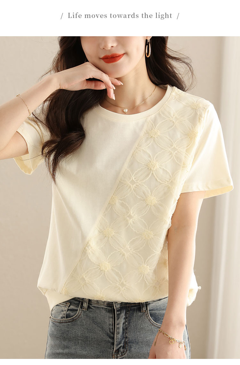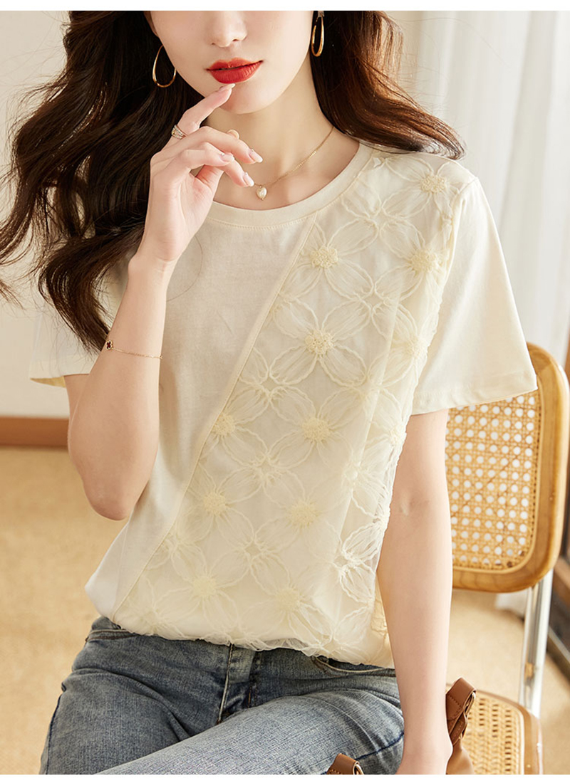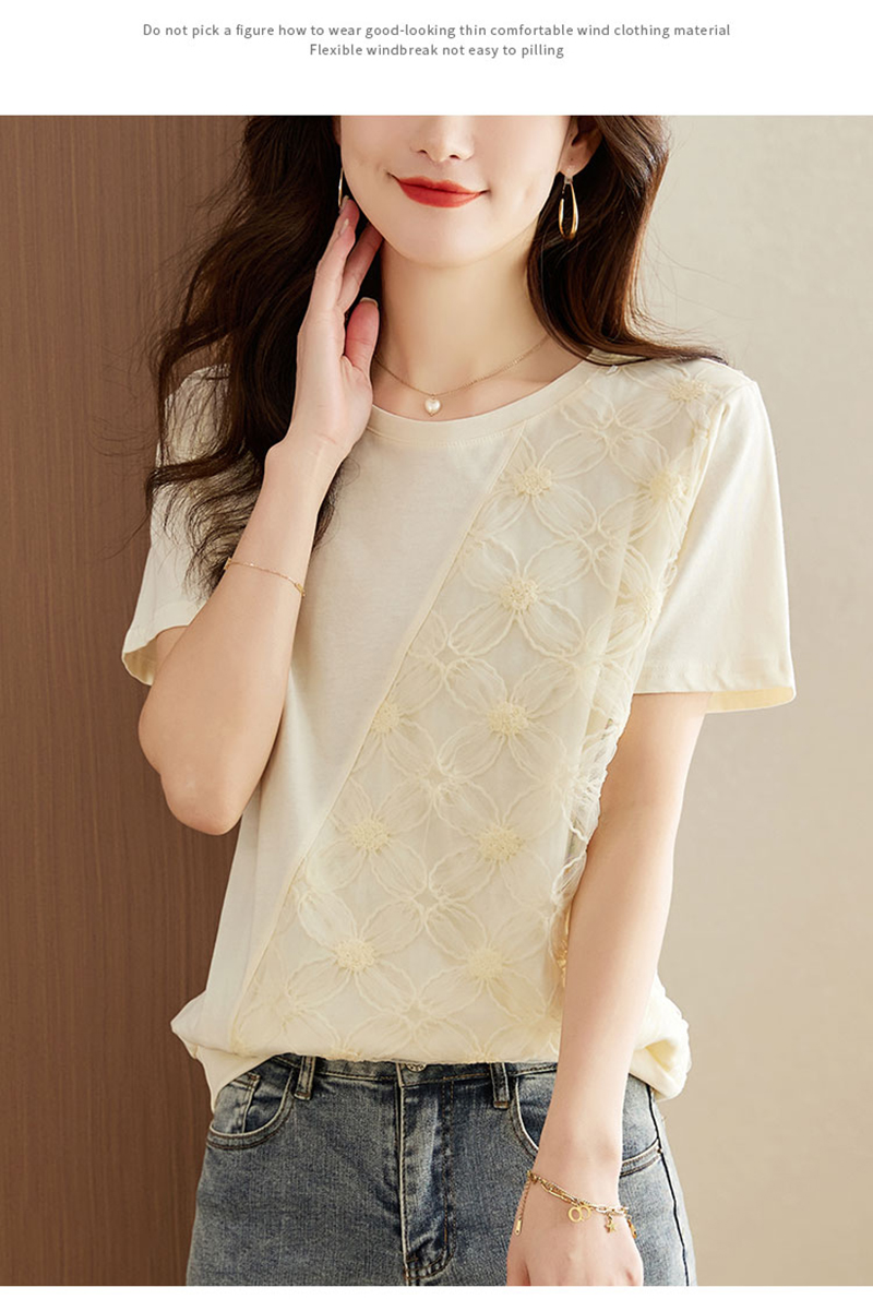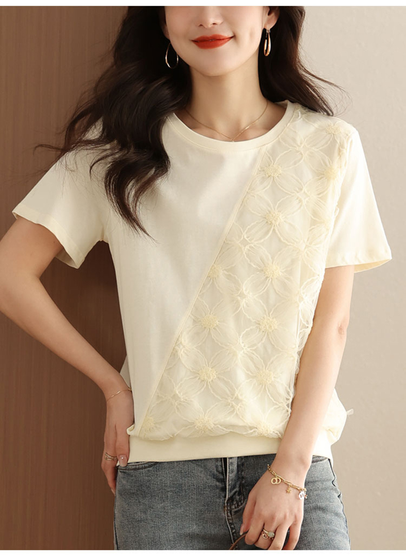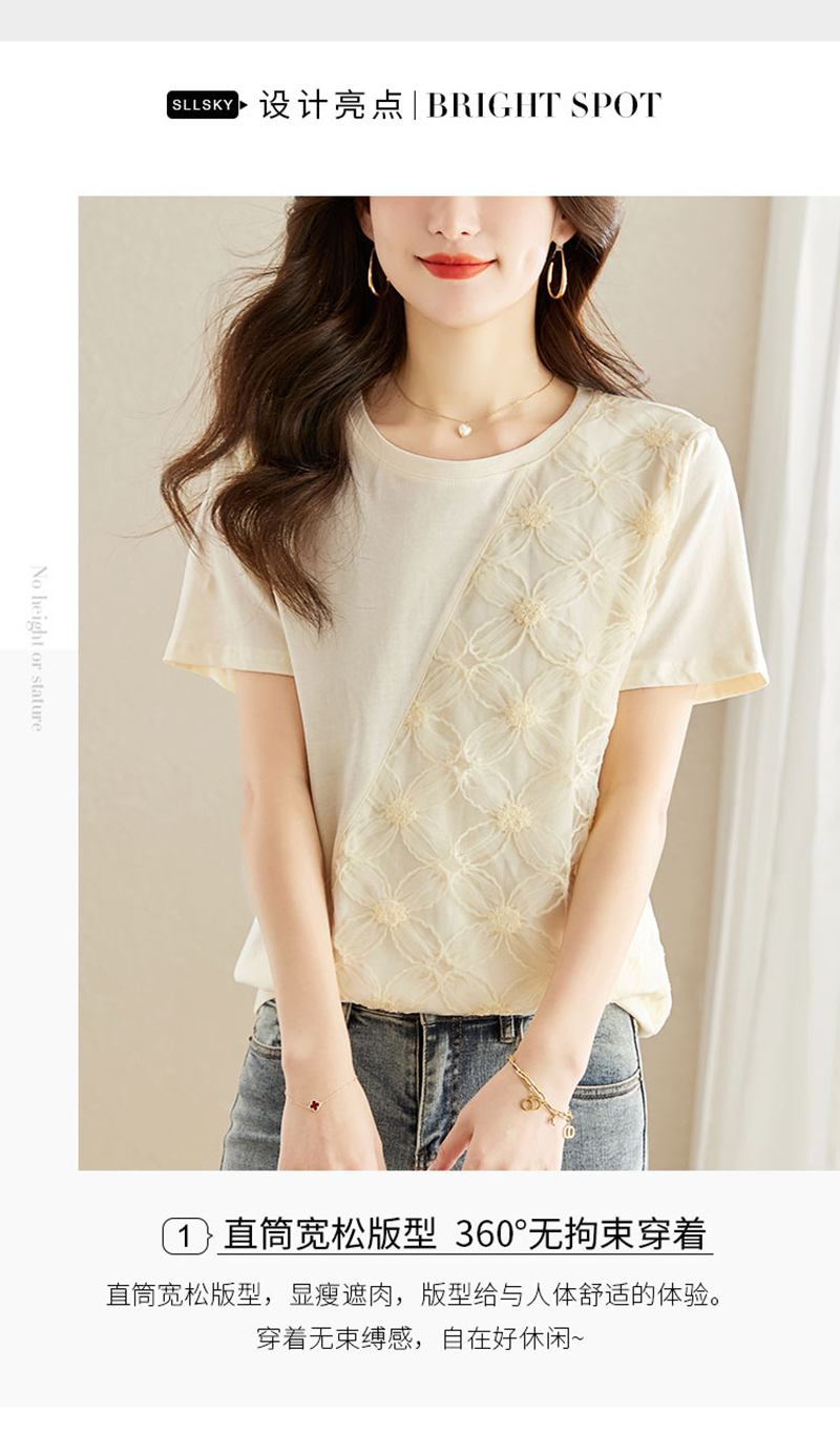 RM6987#短袖t恤女夏季2023新款洋气韩版宽松圆领体恤蕾丝拼接设计感上衣