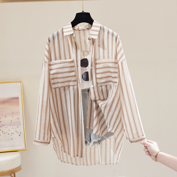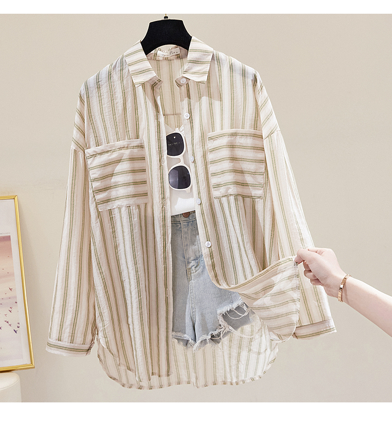 RM7936#粉色条纹防晒衬衫女夏宽松bf慵懒风oversize中长款薄衬衣外套