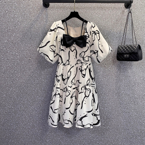 RM8037#夏季新款胖MM精致小名媛蝴蝶结A摆泡泡袖连衣裙