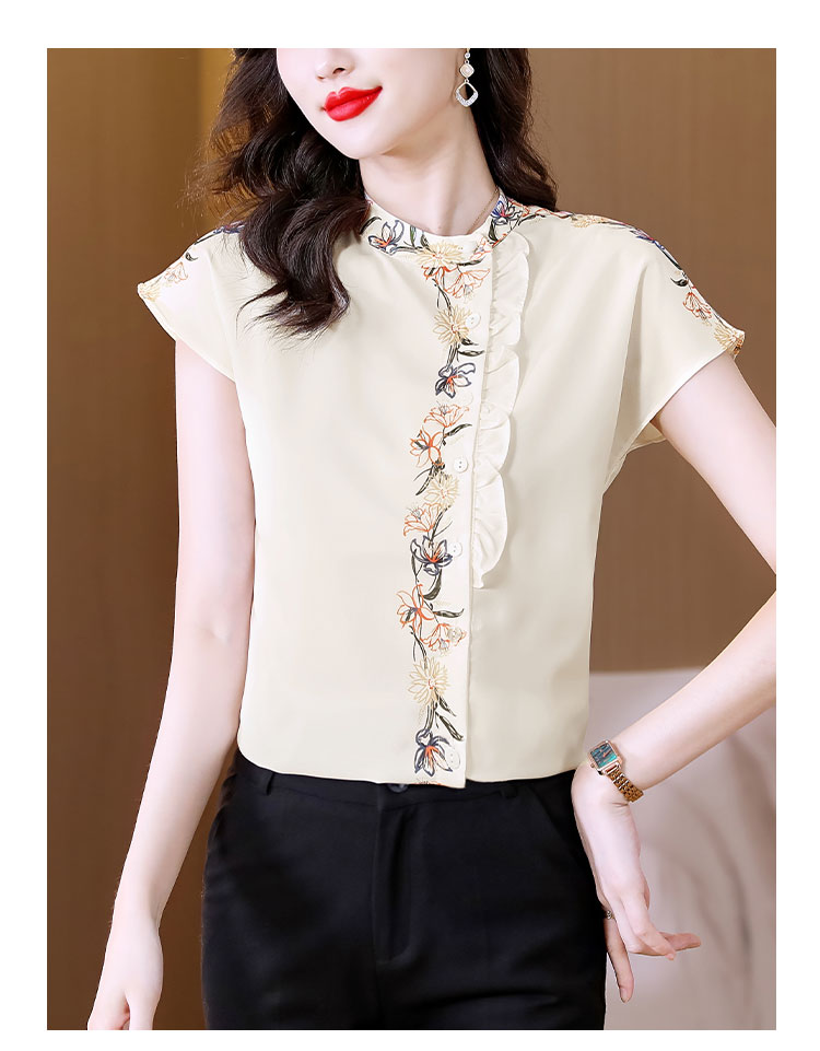RM8133#印花T恤丝质感丝绸衬衫2023年夏装新款木耳翻边气质短袖上衣