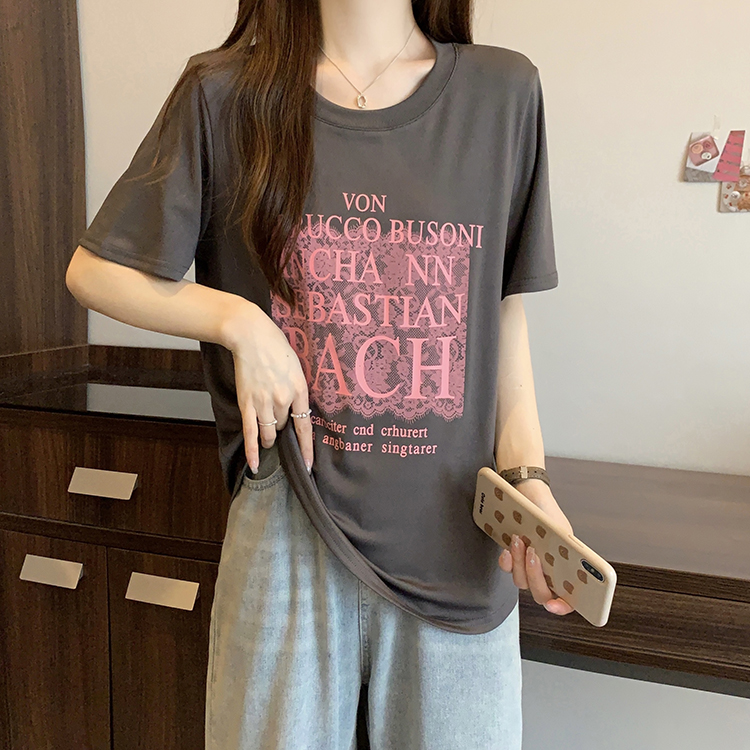 RM8906#夏新款胖mm时尚百搭小众甜辣风蕾丝印花正肩短袖T恤上衣