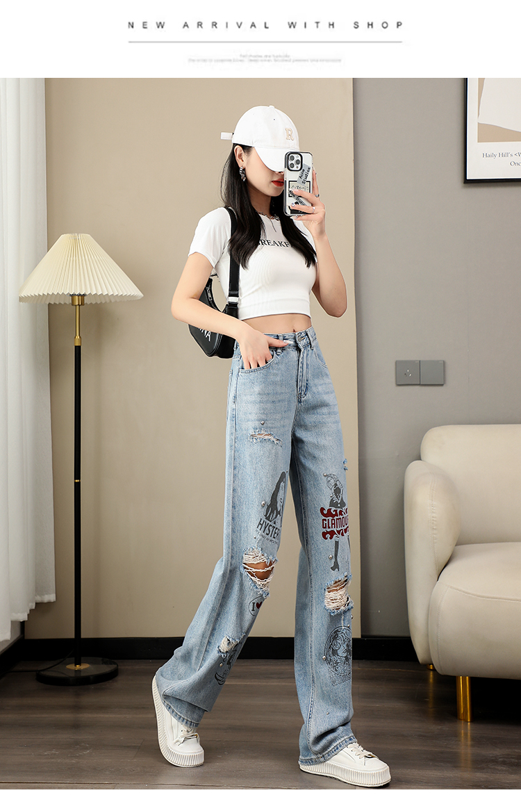 RM8946#破洞阔腿牛仔裤女夏季新款印花图案高腰宽松复古垂感直筒牛仔裤