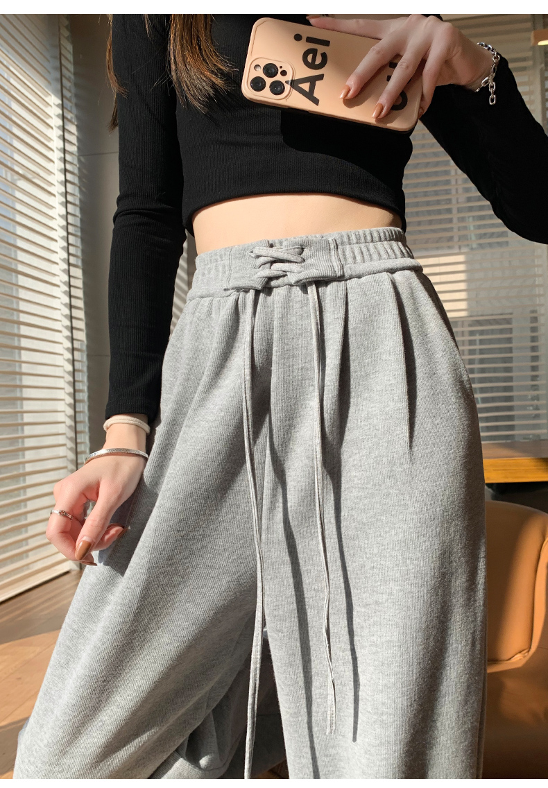 RM9035#灰色运动裤女春秋卫裤休闲高腰垂感拖地梨形身材长裤子抽绳阔腿裤