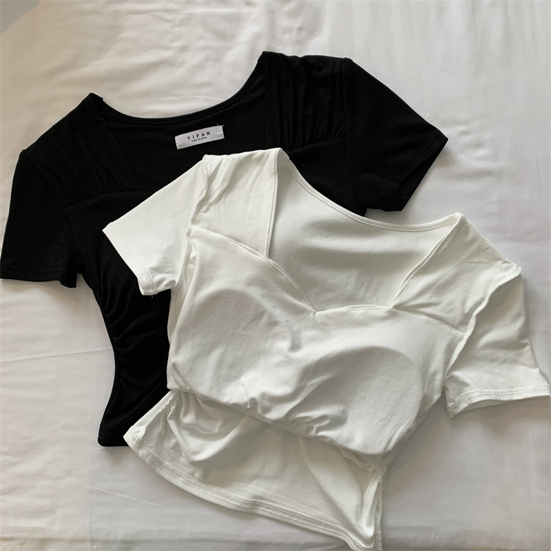 RM9214#大码夏季新款设计感小众修身V领显瘦纯色褶皱短袖T恤女