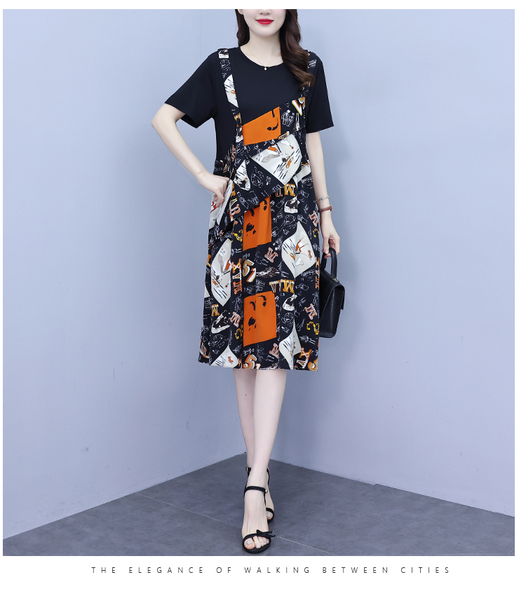 RM9731#夏新款宽松遮肉大码女装假两件时尚碎花中长款A字大摆裙