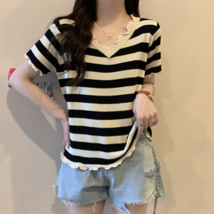 RM9750#大码2023夏装新款胖mm时尚条纹木耳边条纹短袖薄款针织T恤衫