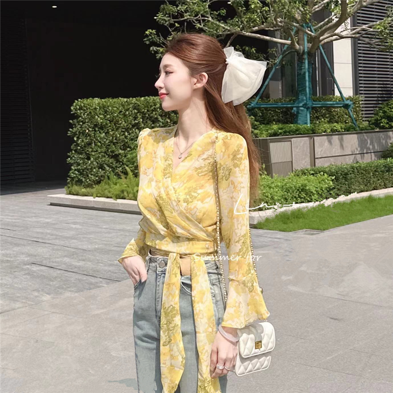 RM10154#法式V领喇叭袖甜美碎花上衣女夏季小众设计绑带雪纺衫潮