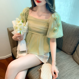 RM10187#夏季新款雪纺T恤法式方领泡泡短袖小清新上衣立体花纱
