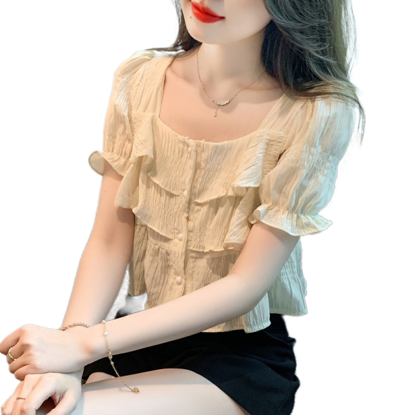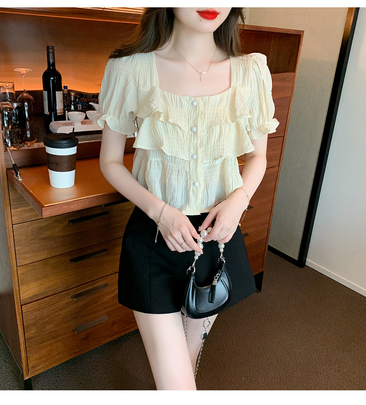 RM10188#夏季新款雪纺小衫短袖T恤法式 方领荷叶边裙纯色