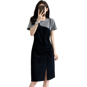 RM10592#中长款T恤裙撞色拼接假两件大码连衣裙