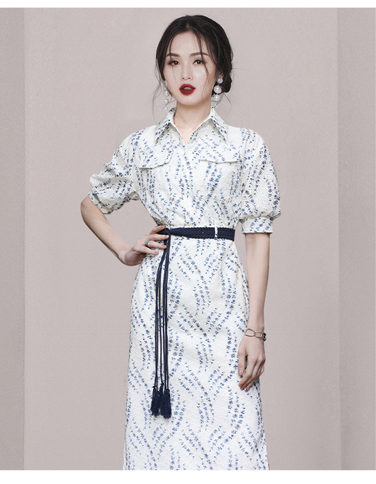 RM10670#夏季新款时尚气质印花刺绣灯笼袖通勤收腰开衩衬衣连衣裙