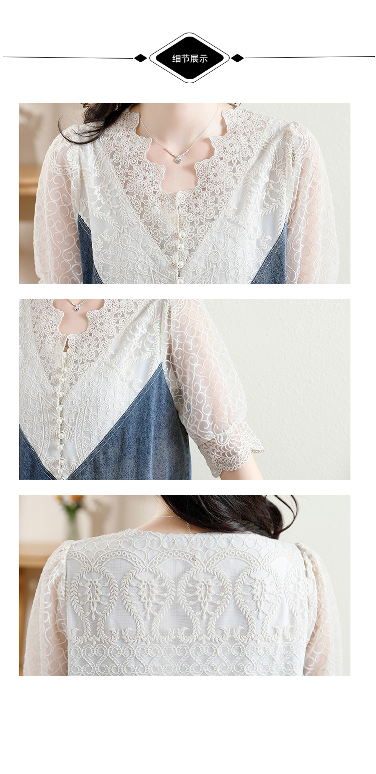 RM11019#V领假两件大码牛仔裙女夏季胖mm宽松气质蕾丝拼接连衣裙