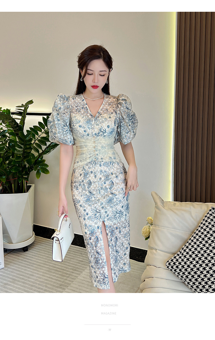 RM12467#新款气质名媛御姐风泡泡袖法式高级感碎花裙女夏