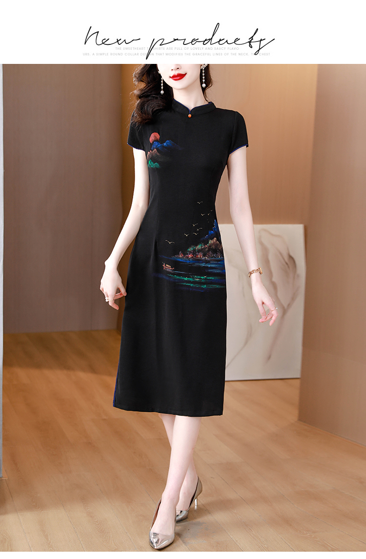 RM12885#真丝改良版旗袍桑蚕丝收腰连衣裙中长款中年妈妈裙子手绘花女装