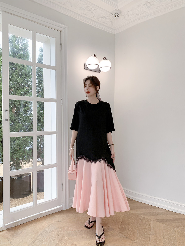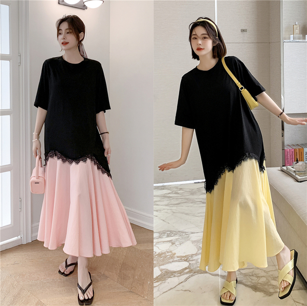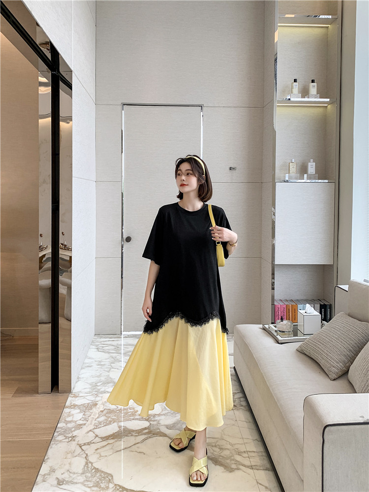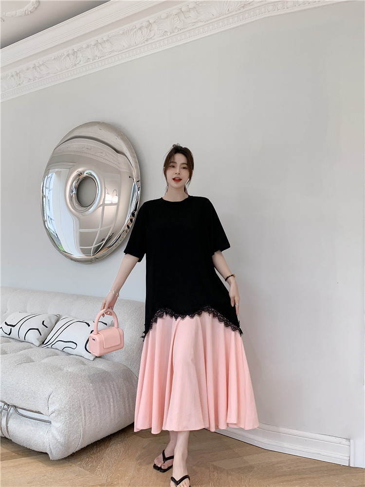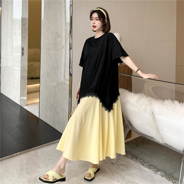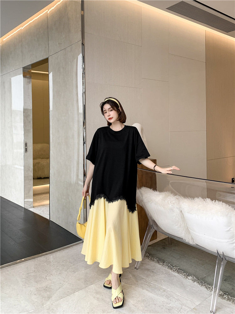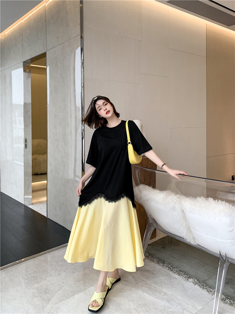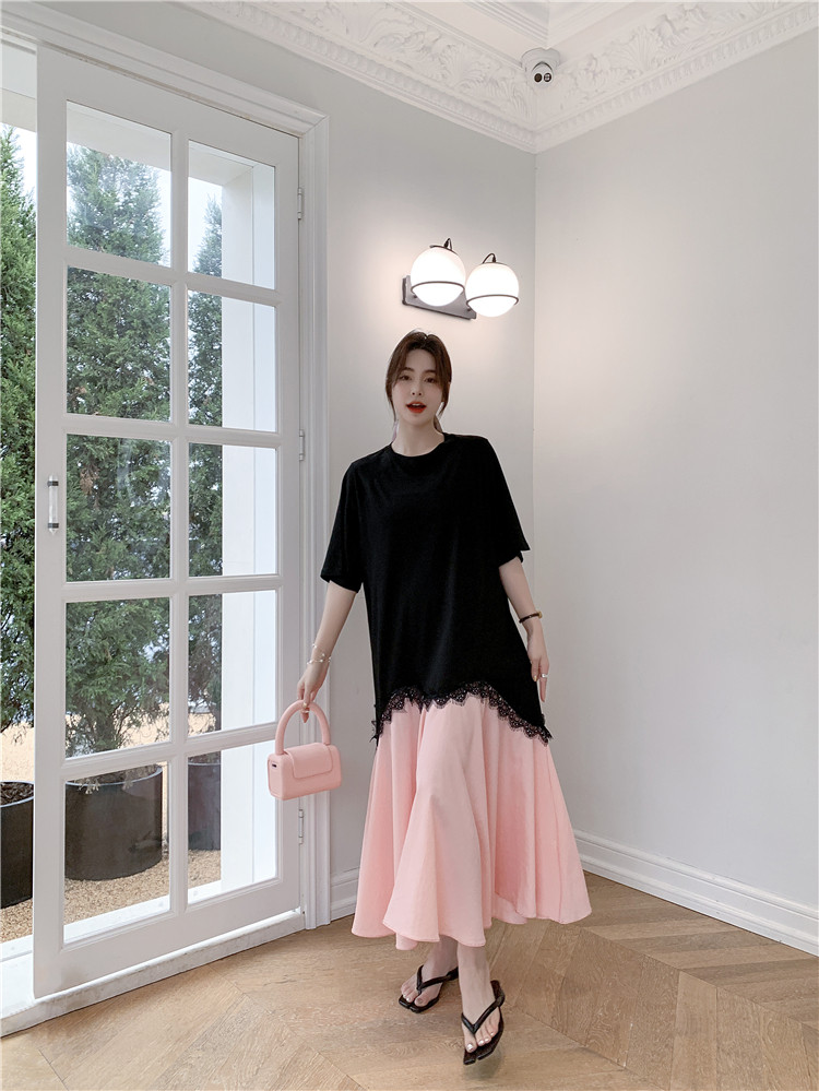 RM12910#夏新款/大码宽松长款宽松蕾丝鱼尾假两件拼接连衣裙