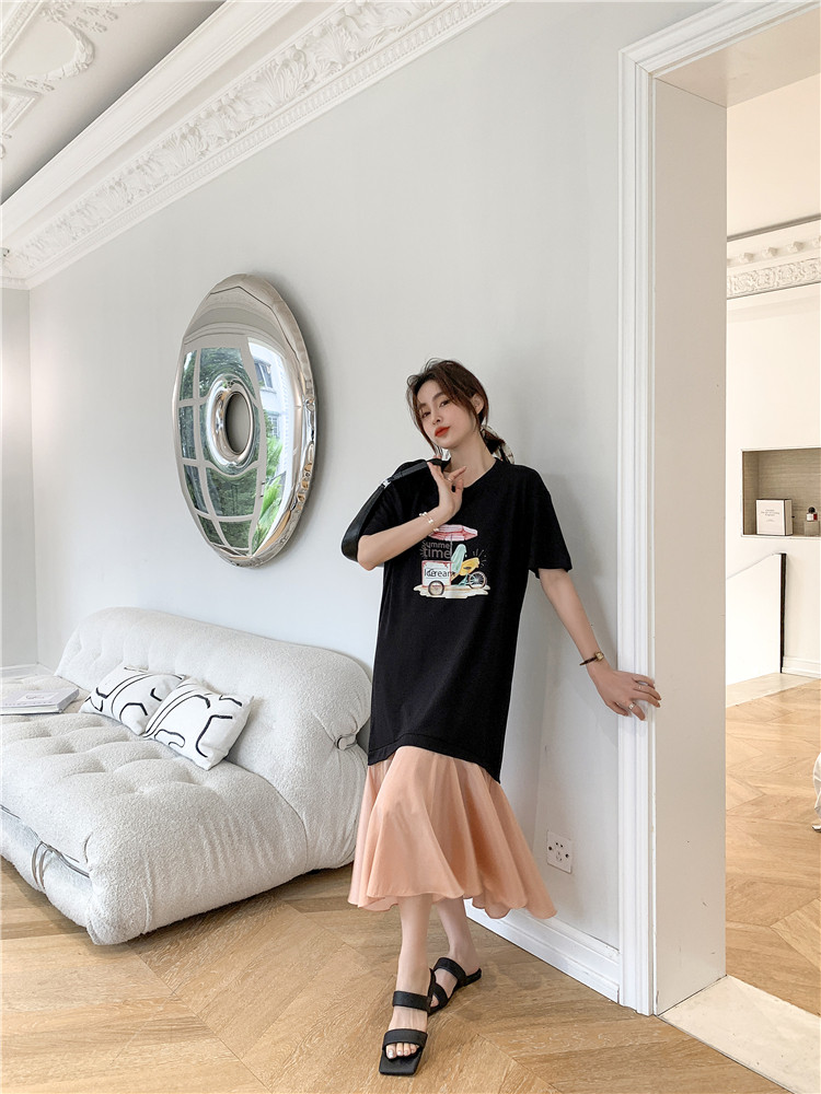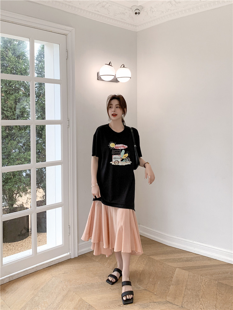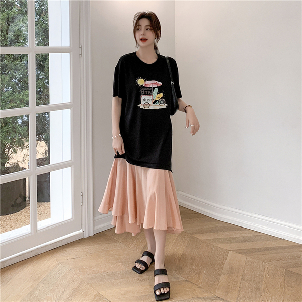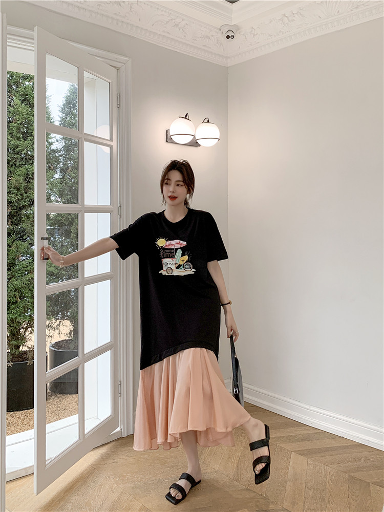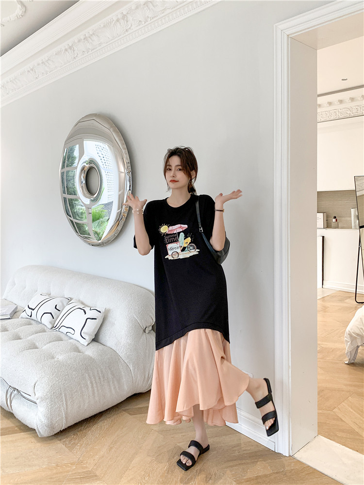 RM12911#夏新款/大码宽松长款假两件印花鱼尾裙t恤连衣裙女