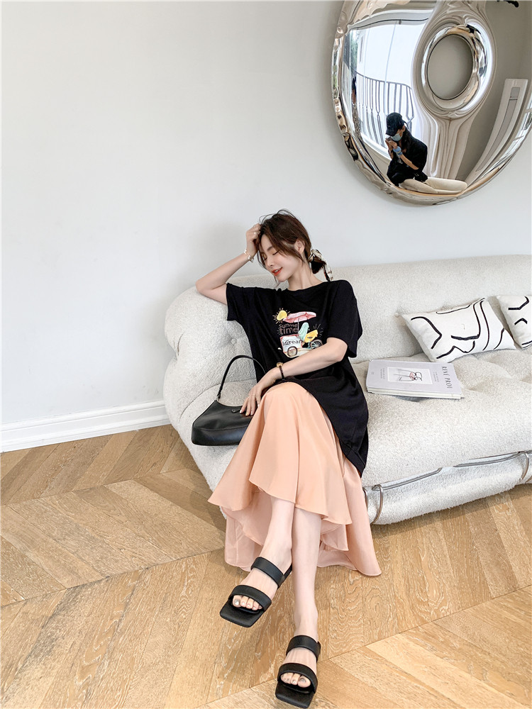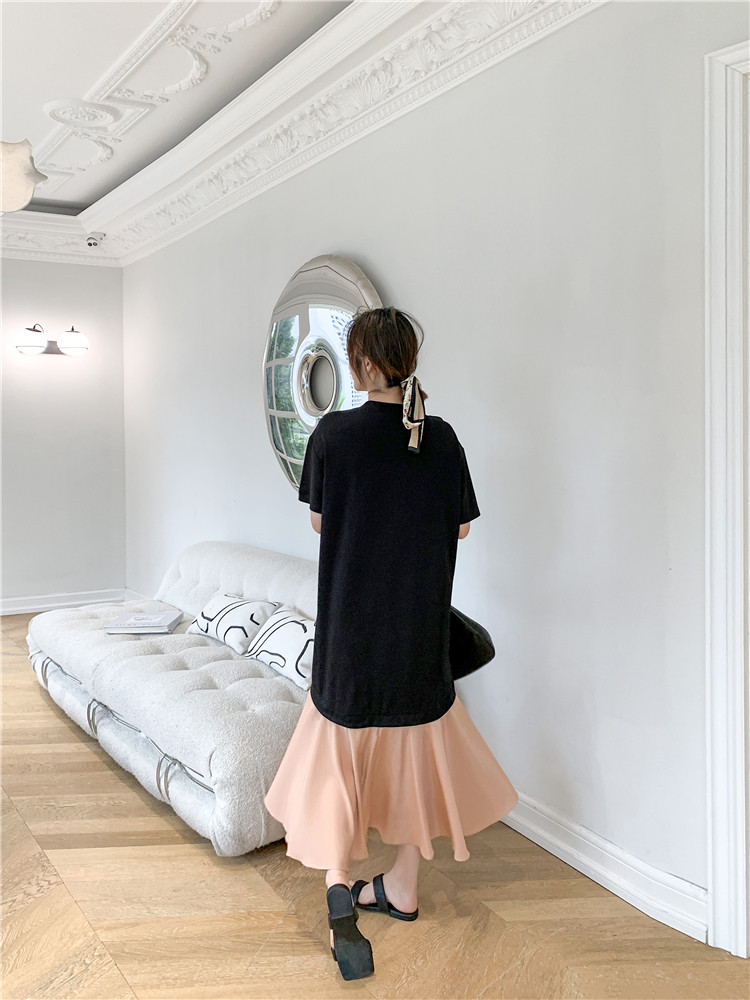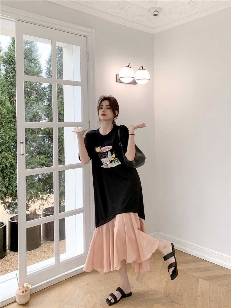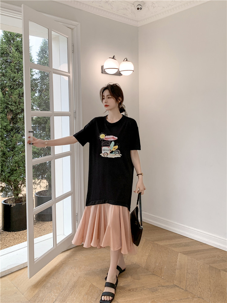 RM12911#夏新款/大码宽松长款假两件印花鱼尾裙t恤连衣裙女
