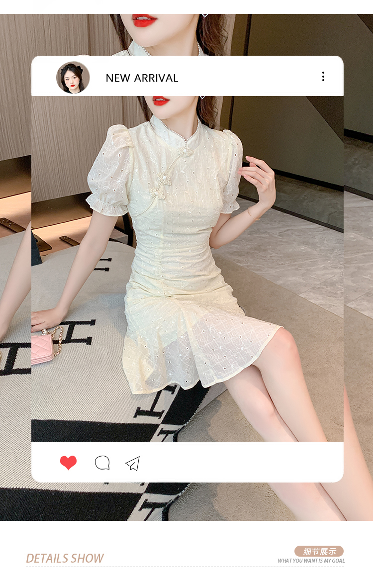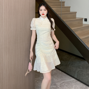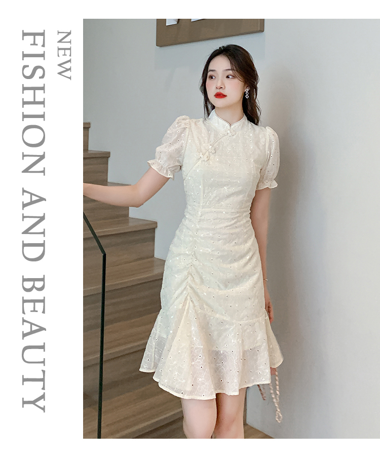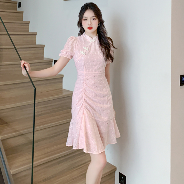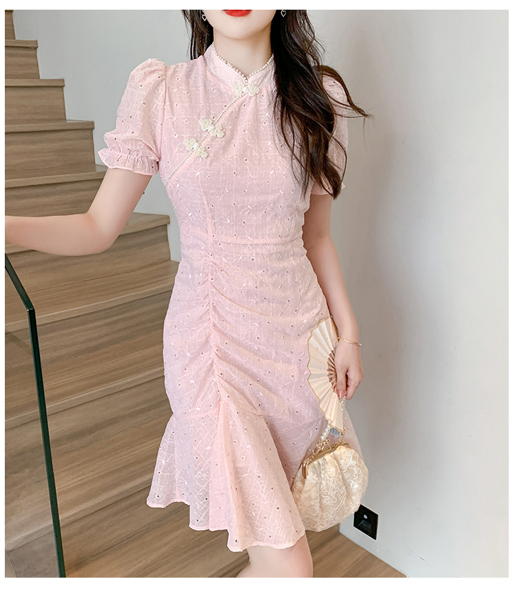 RM13108#夏季新款改良旗袍甜美小清新收腰褶皱鱼尾摆绣花连衣裙
