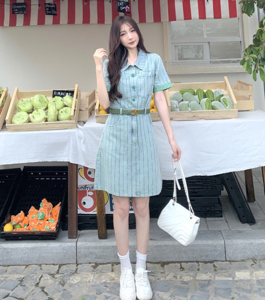 RM13352#大码微胖MM夏季减龄绿色条纹短袖POLO翻领连衣裙女宽松裙子