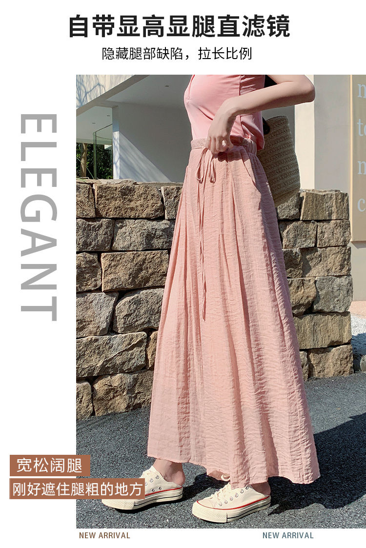 RM13426#棉麻裸粉飘飘裙夏季新款雪纺高腰系带半身裙A字中长裙阔腿裤