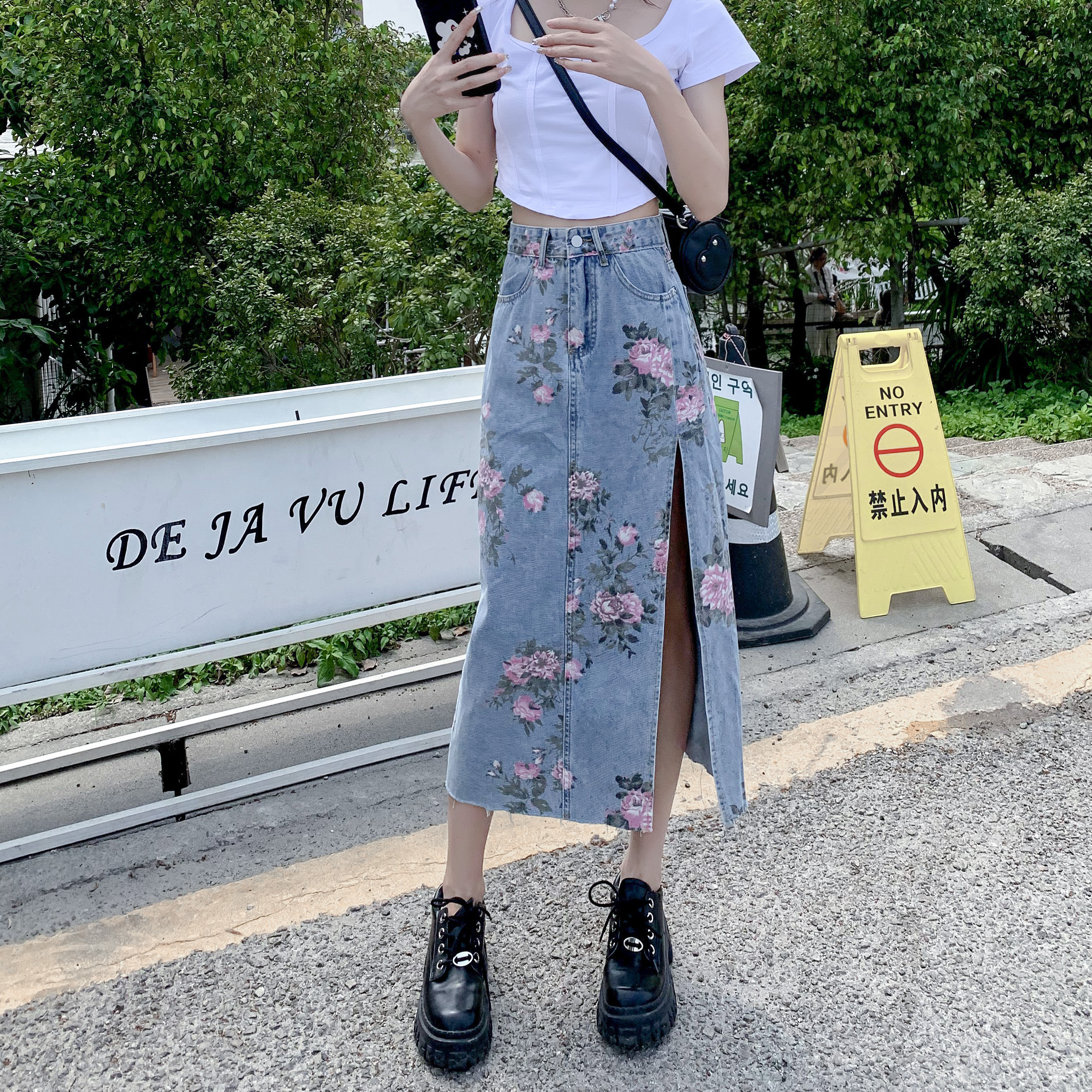 RM13636#设计感侧开叉牛仔半身裙女大码胖MM高腰显瘦碎花长款包臀裙
