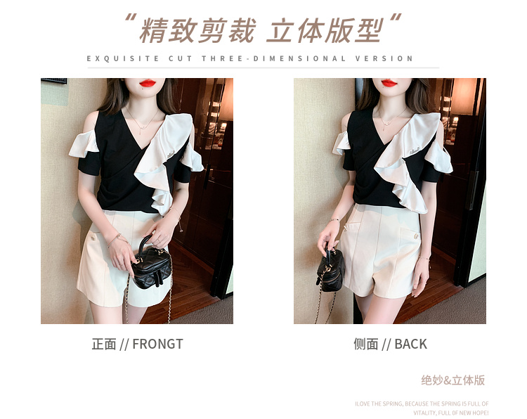 RM13678#夏韩版设计感短袖洋气拼雪纺重工露肩气质上衣t恤