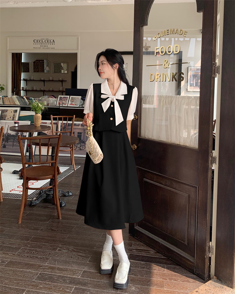RM13698#大码女装学院风2023年夏季法式翻领系带优雅气质绝美假两件连衣裙