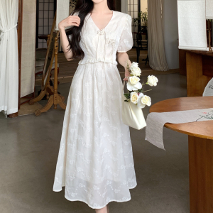 RM13700#新中式米色刺绣V领连衣裙女2023夏季胖mm国风中长款高腰短袖裙子
