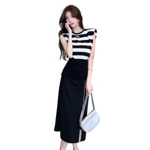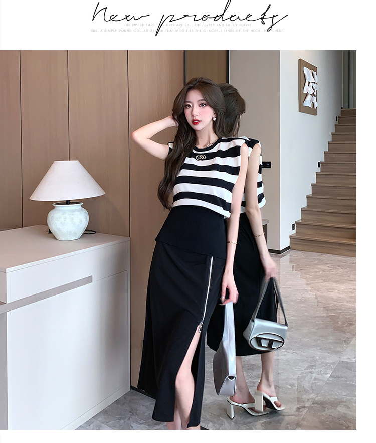 RM13746#后背系带垫肩针织上衣+褶皱拉链开衩显瘦气质半裙两件套