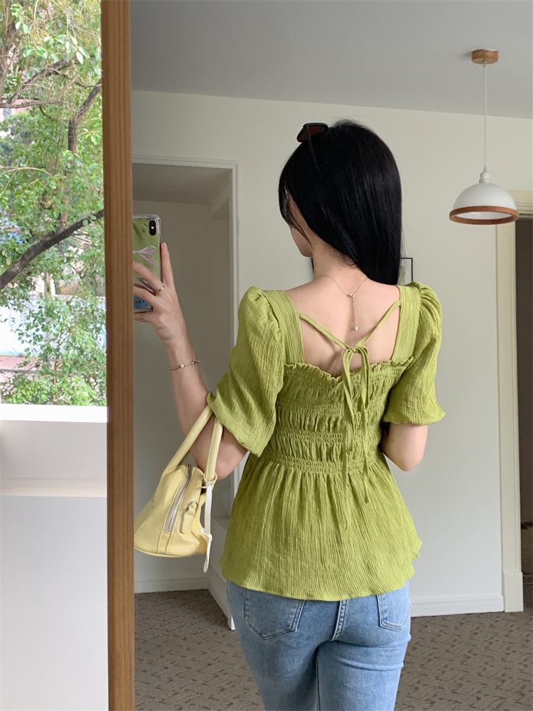 RM13782#大码夏季法式木耳边衬衫短袖修身显瘦泡泡袖短款上衣