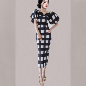 RM13851#夏季新款法式复古黑白格桃心领泡泡袖气质修身中长款包臀连衣