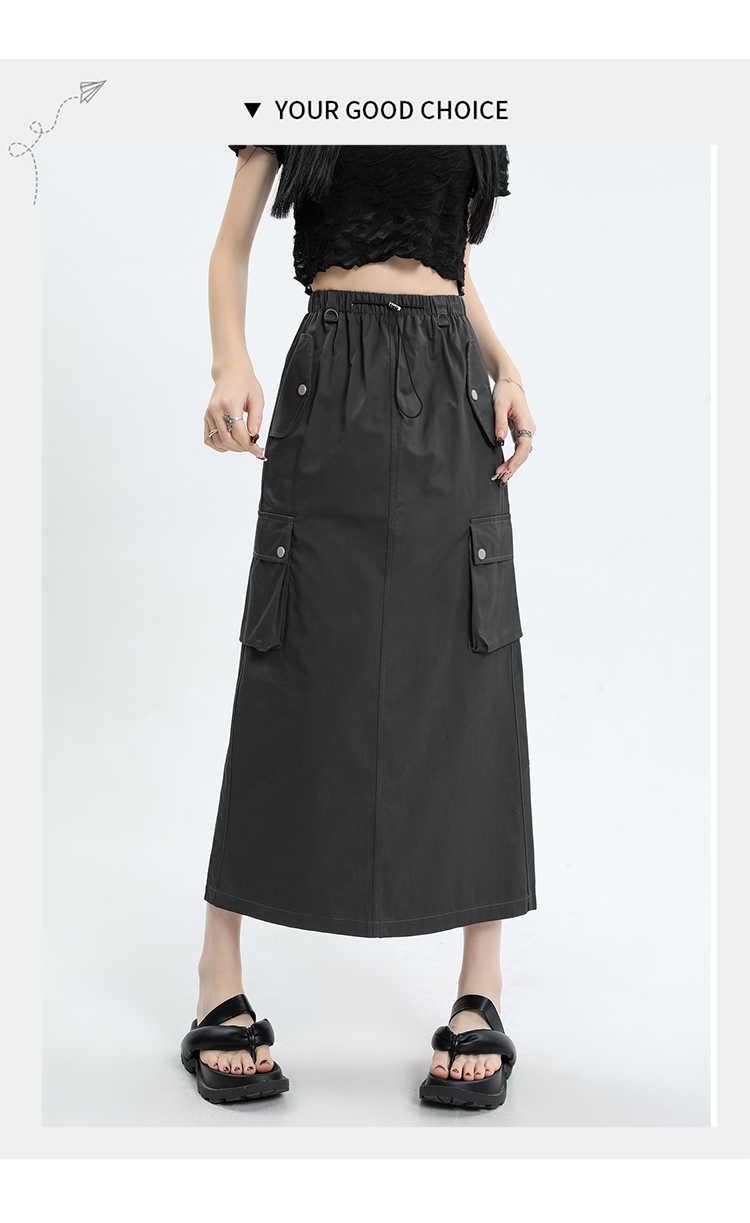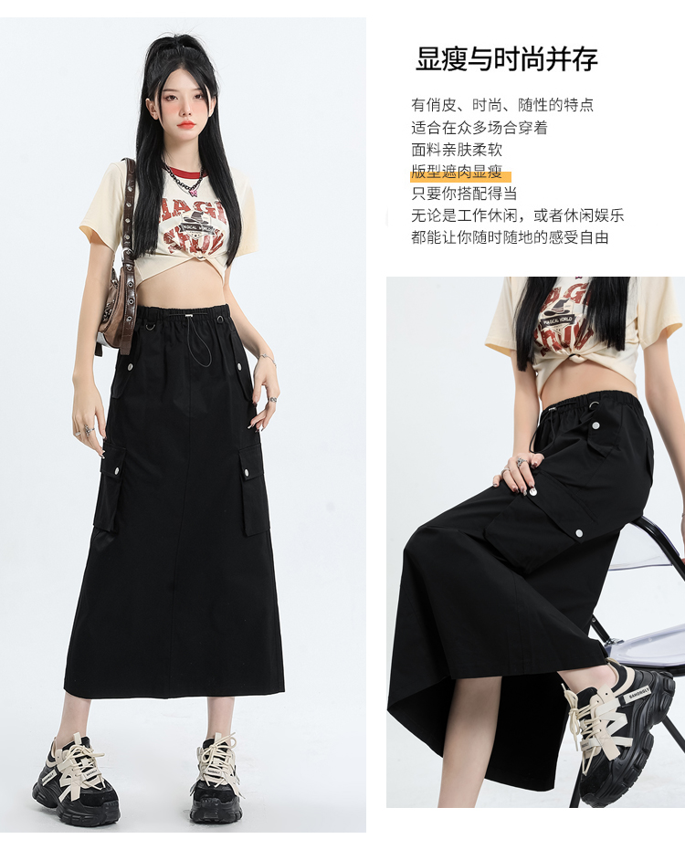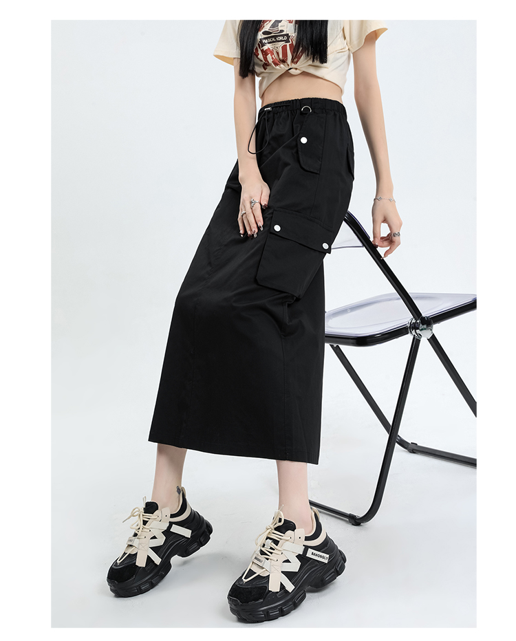 RM13916#复古抽绳工装半身裙女2023夏季新款开叉高腰宽松A字长裙裙子