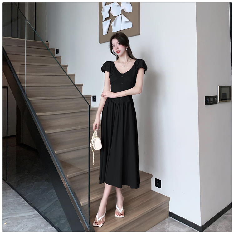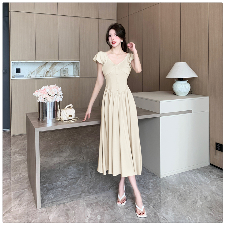 RM14001#法式气质温柔流行多巴胺穿搭v领泡泡袖高腰过膝初恋连衣裙长裙夏