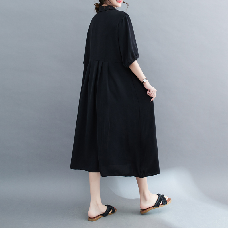 RM14013#大码女装小黑裙宽松显瘦连衣裙夏装过膝短袖雪纺衬衫长裙子