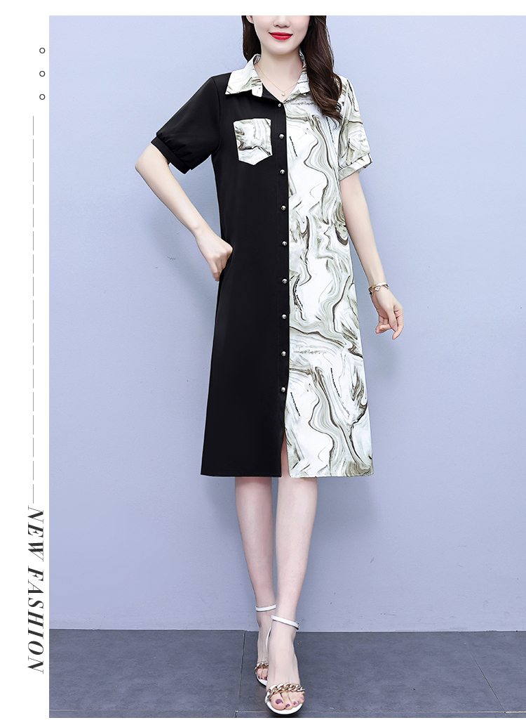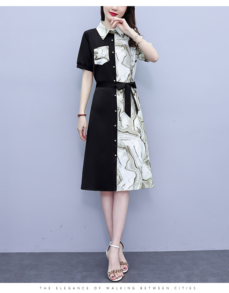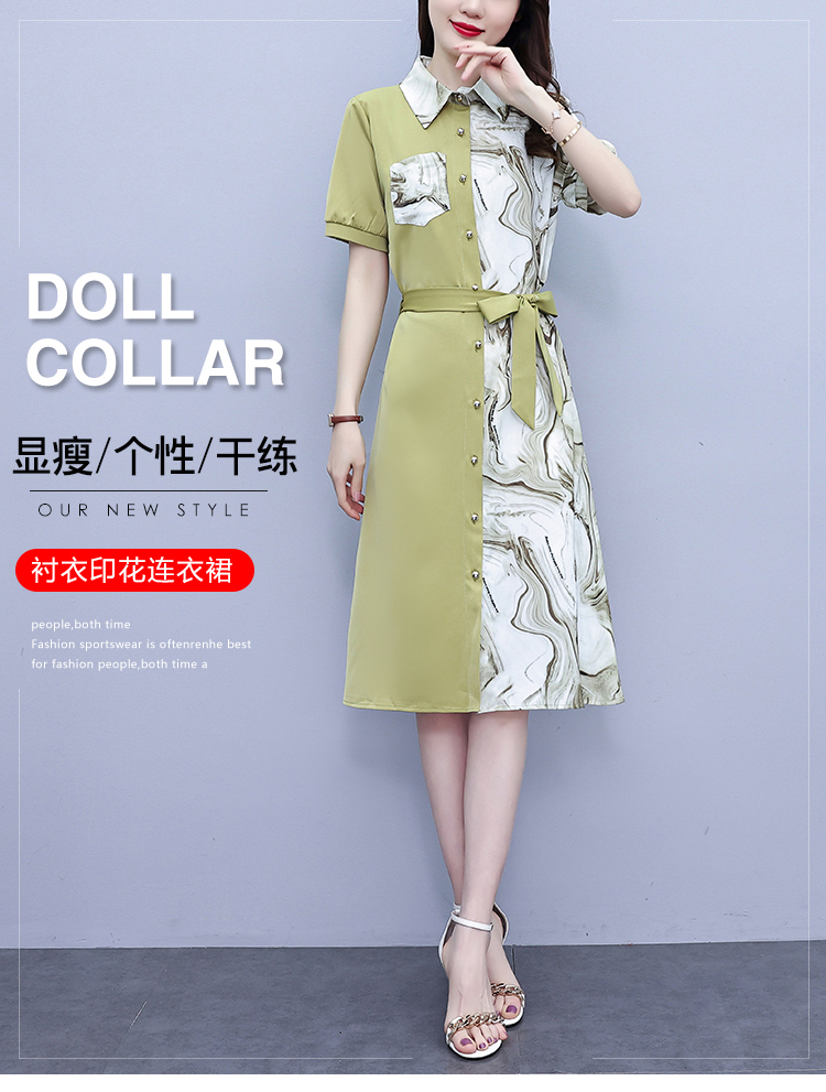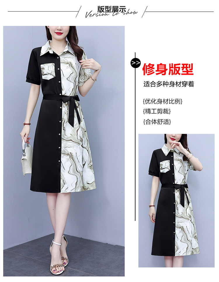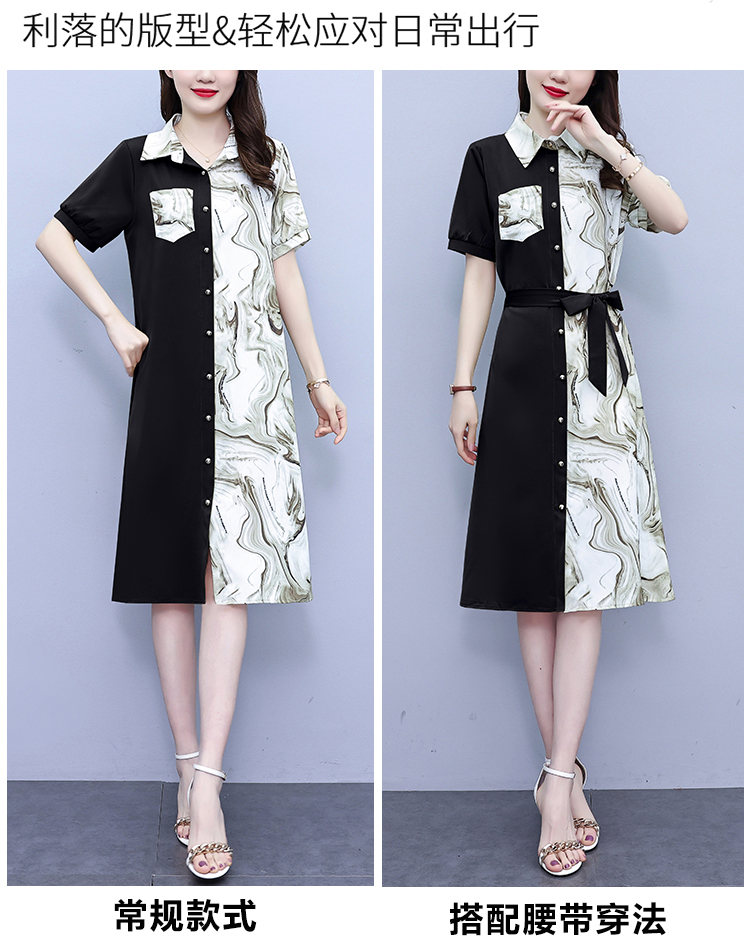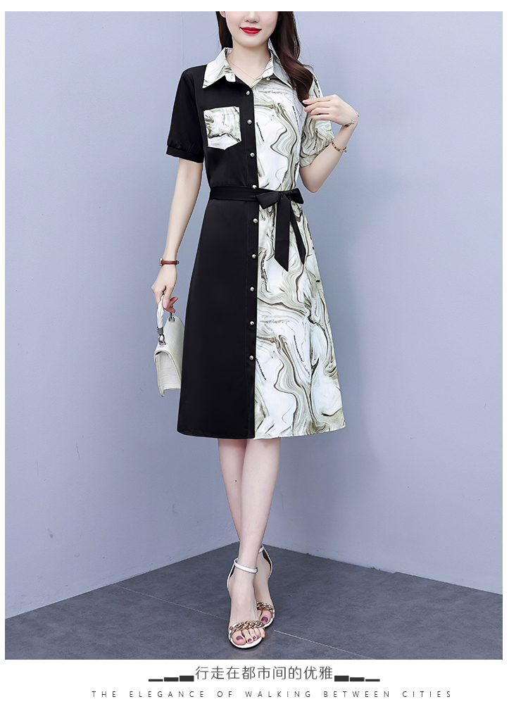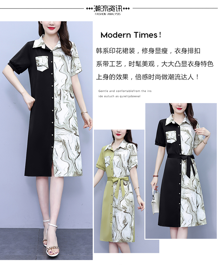 RM14063#大码女装2023夏季新款拼接撞色印花精致简约气质收腰衬衫连衣裙