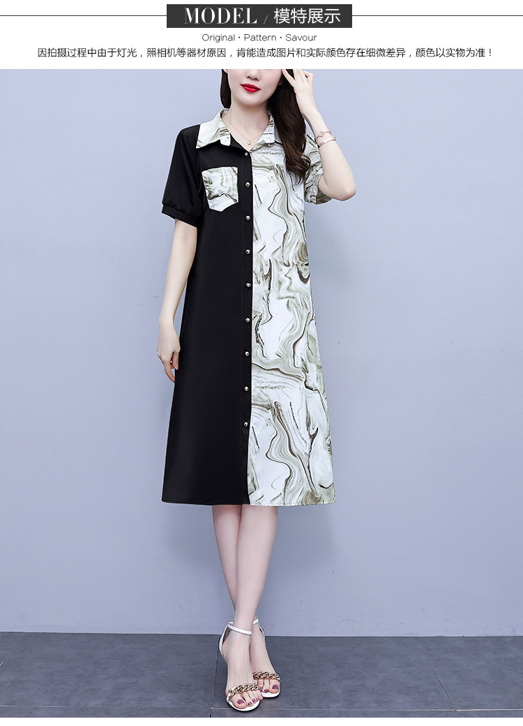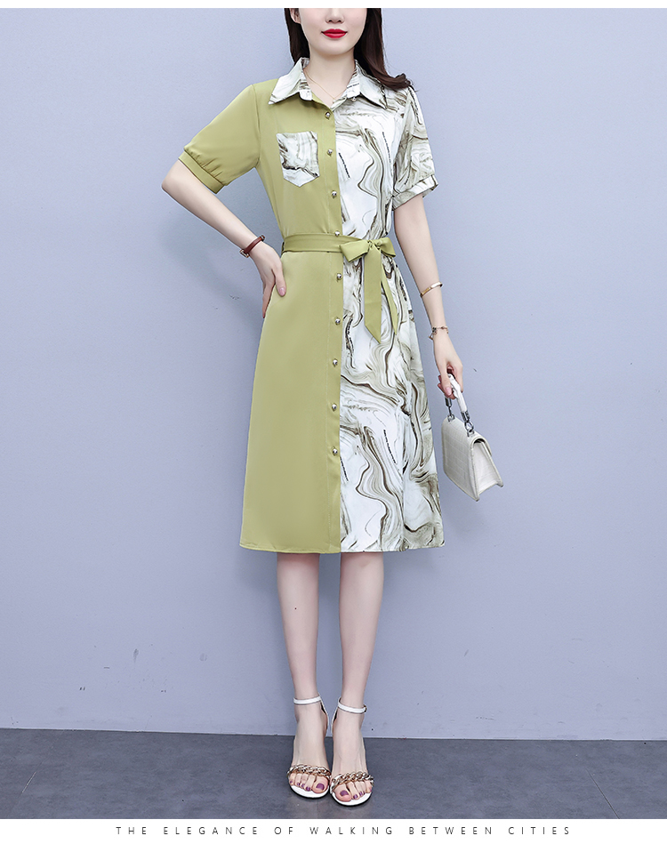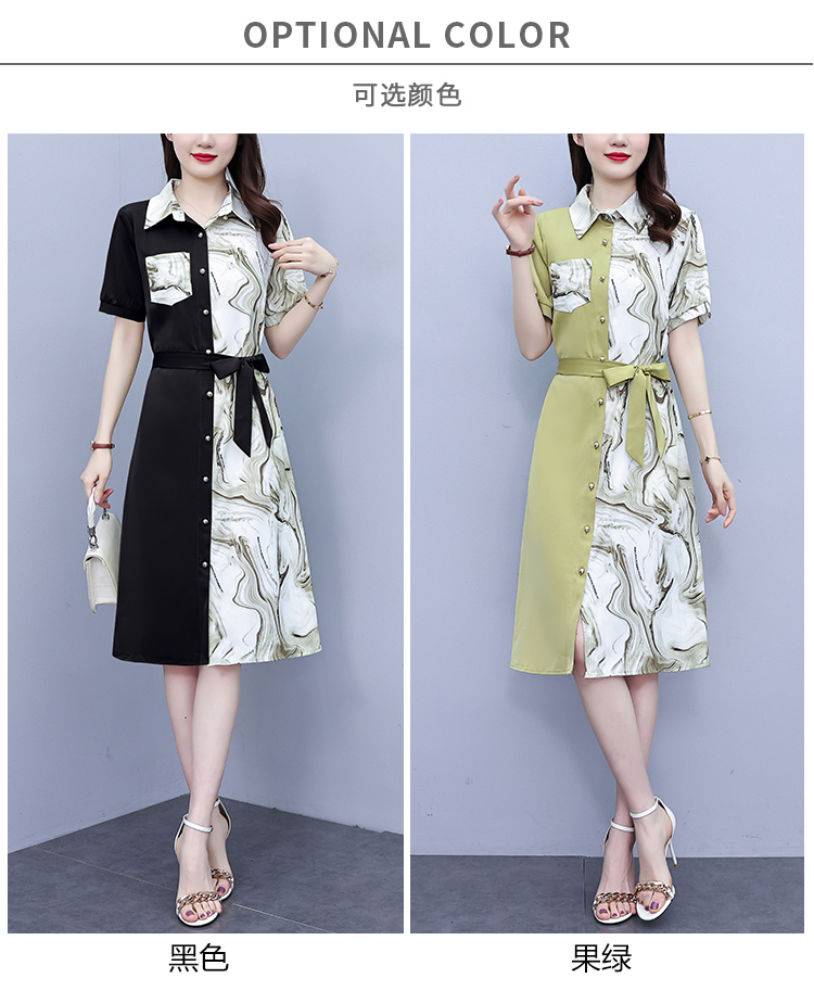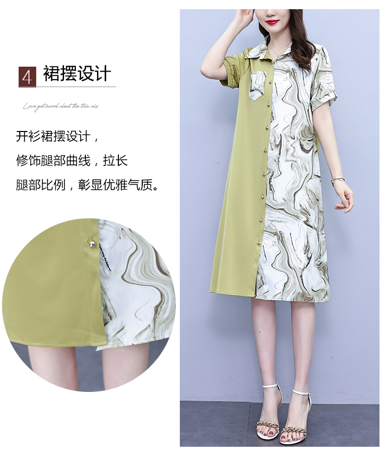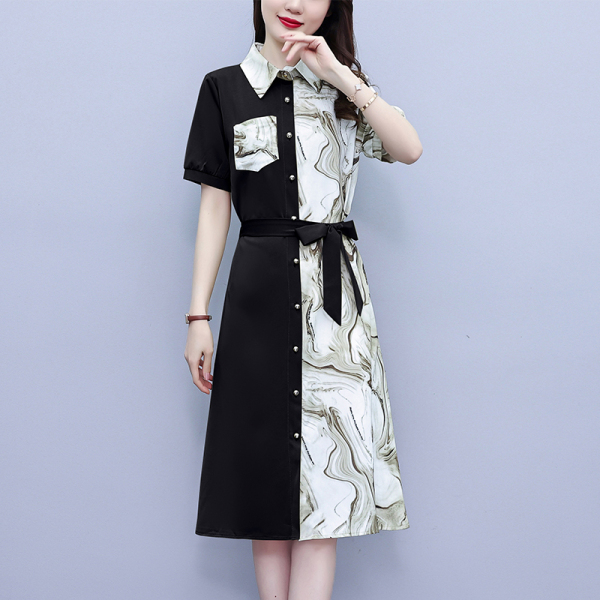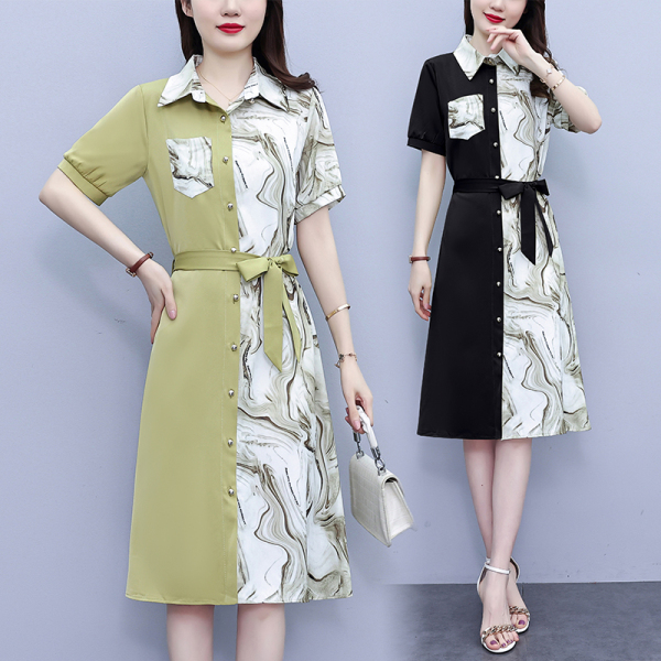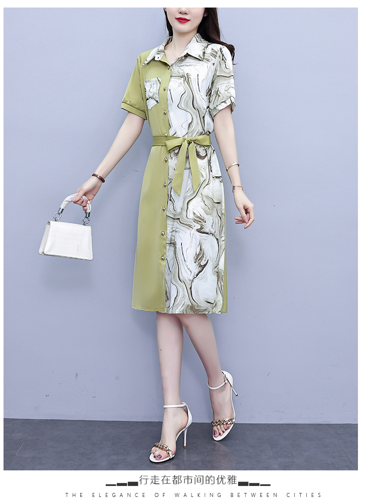RM14063#大码女装2023夏季新款拼接撞色印花精致简约气质收腰衬衫连衣裙