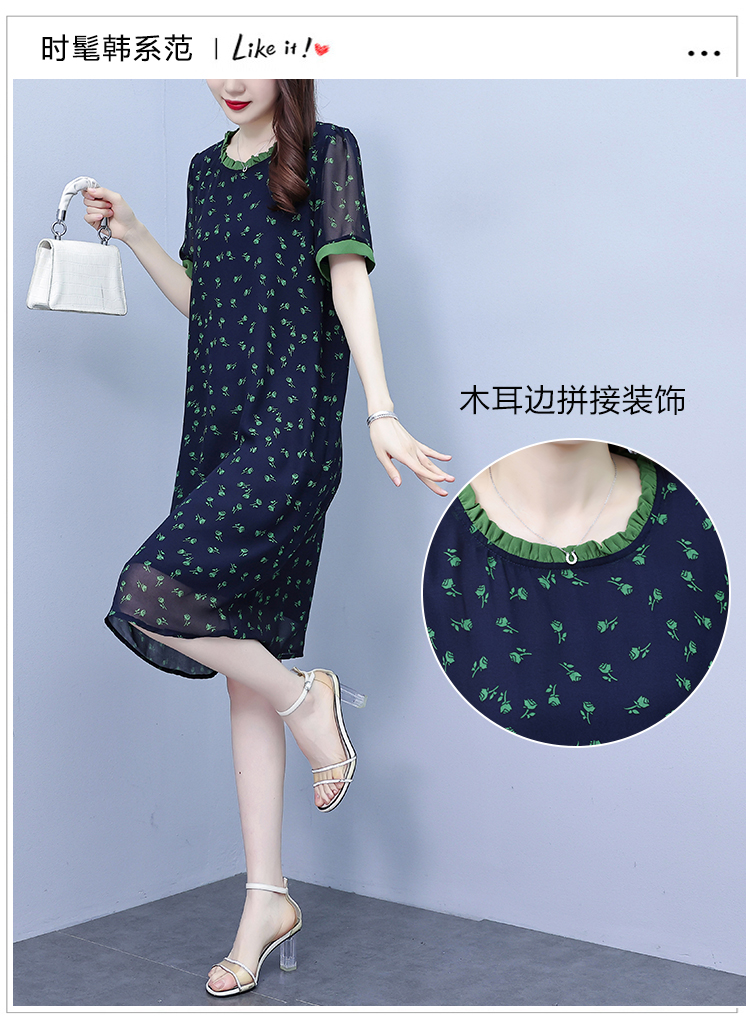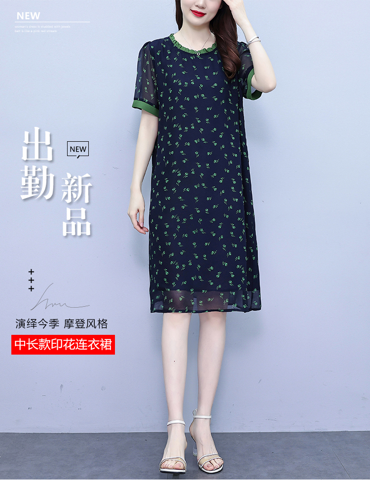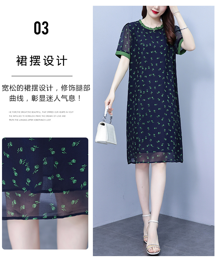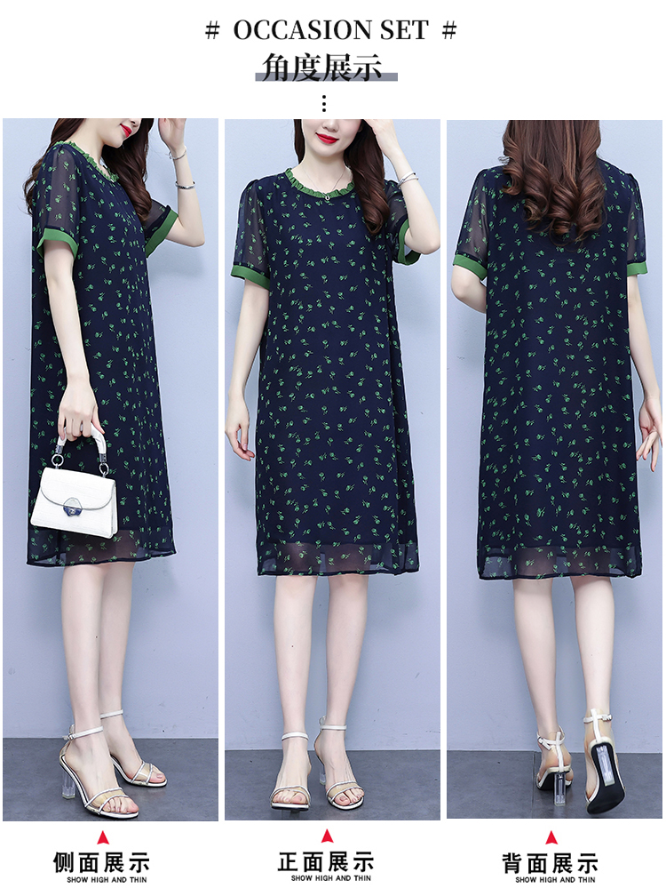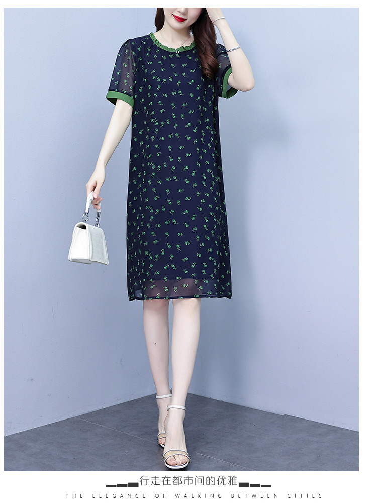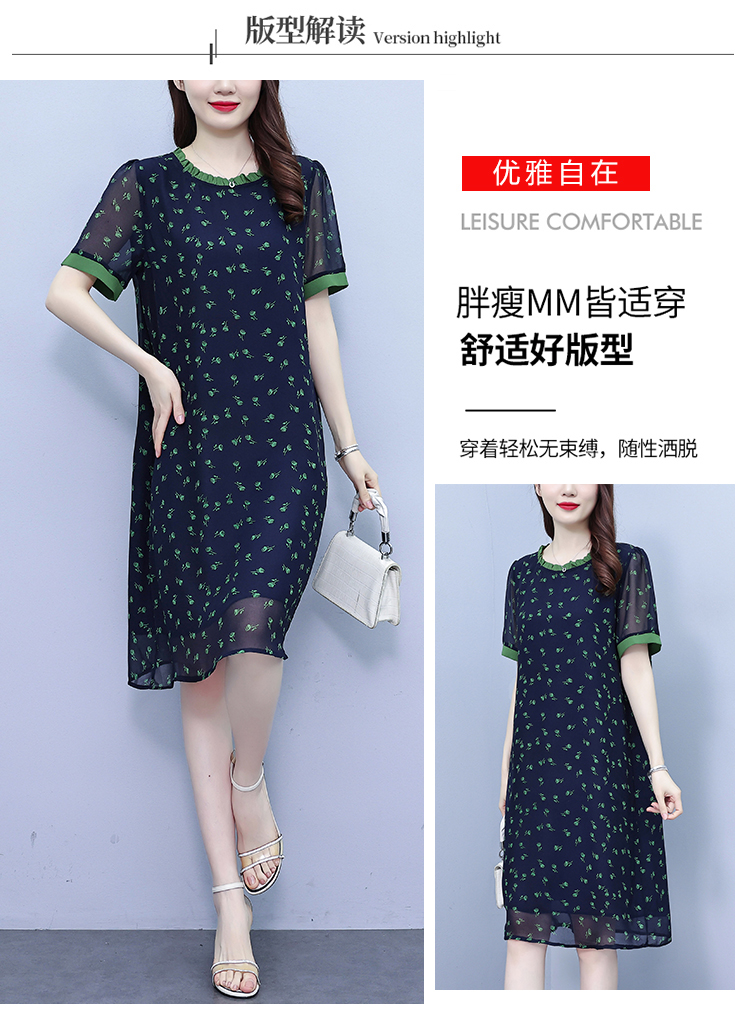 RM14075#大码女装2023夏季新款时尚遮肉显瘦气质圆领雪纺中长款连衣裙
