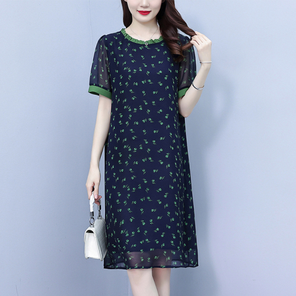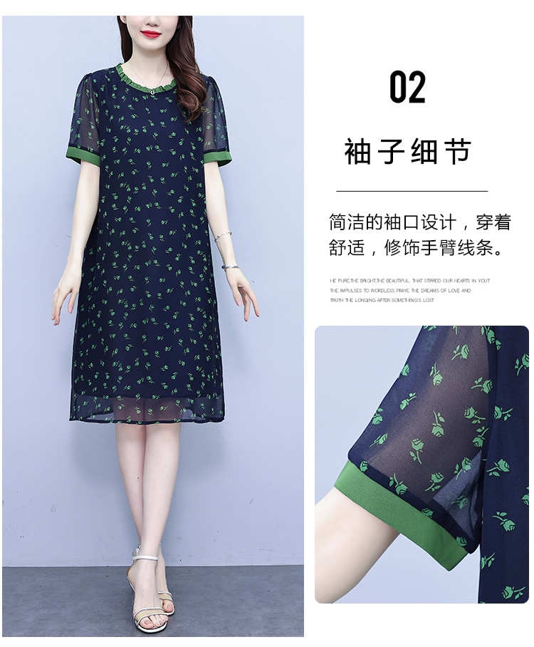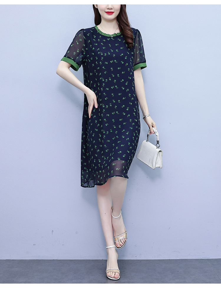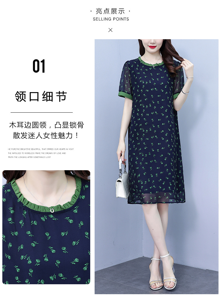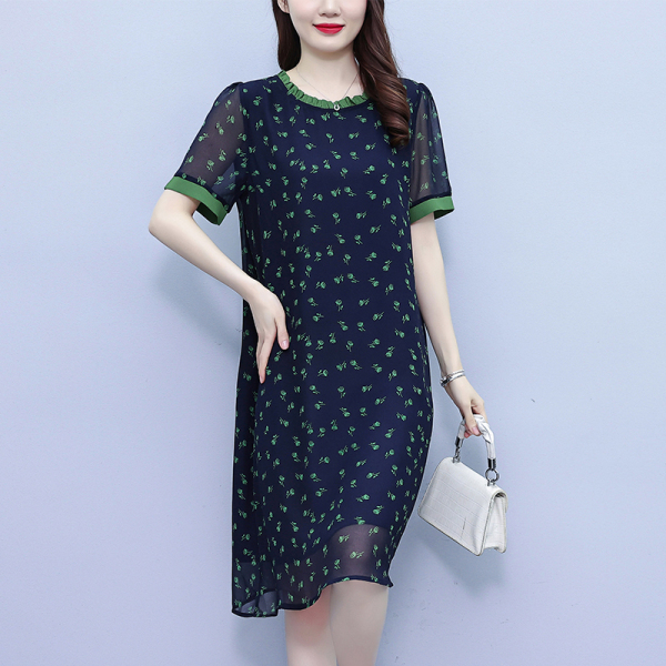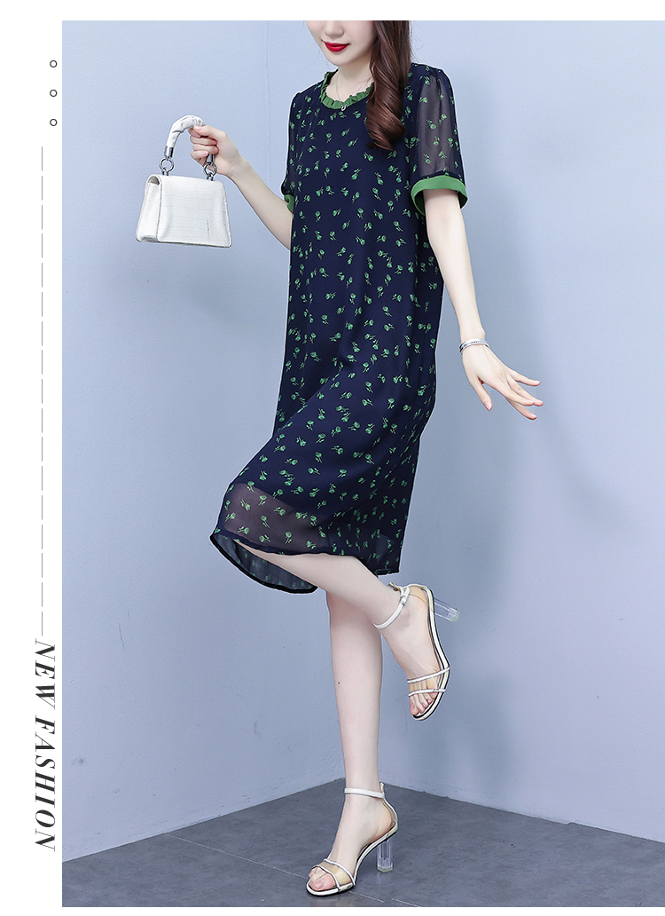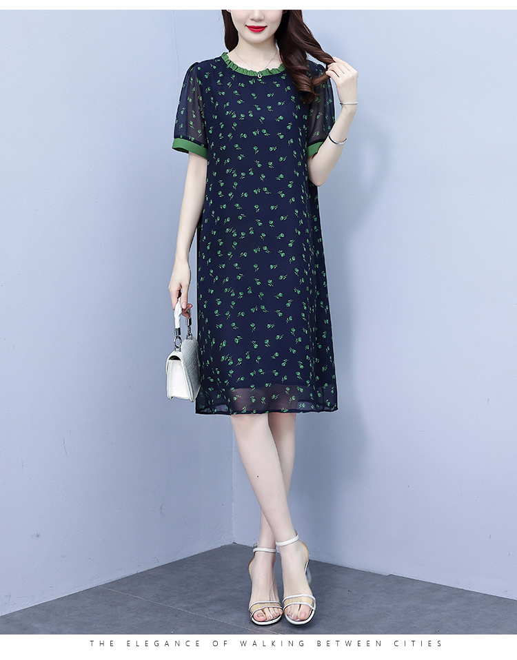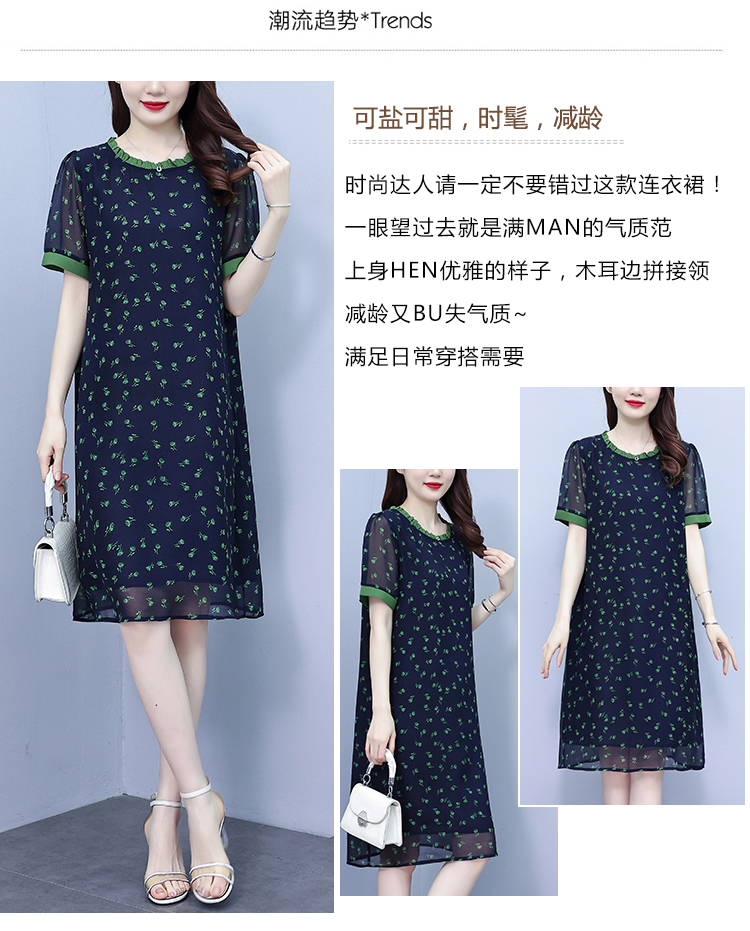 RM14075#大码女装2023夏季新款时尚遮肉显瘦气质圆领雪纺中长款连衣裙