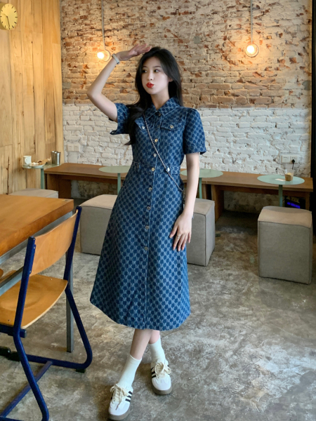 RM14363#大码女装个性提花字母牛仔连衣裙胖MM藏肉显瘦中长款牛仔裙