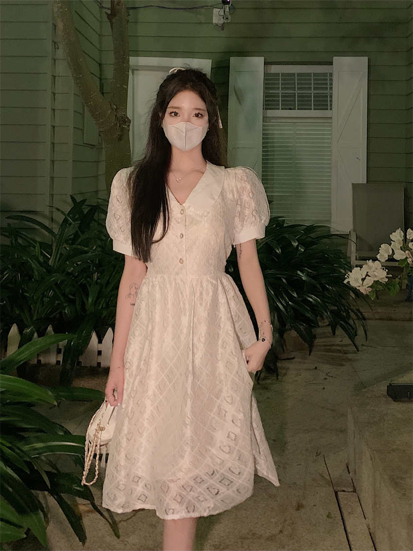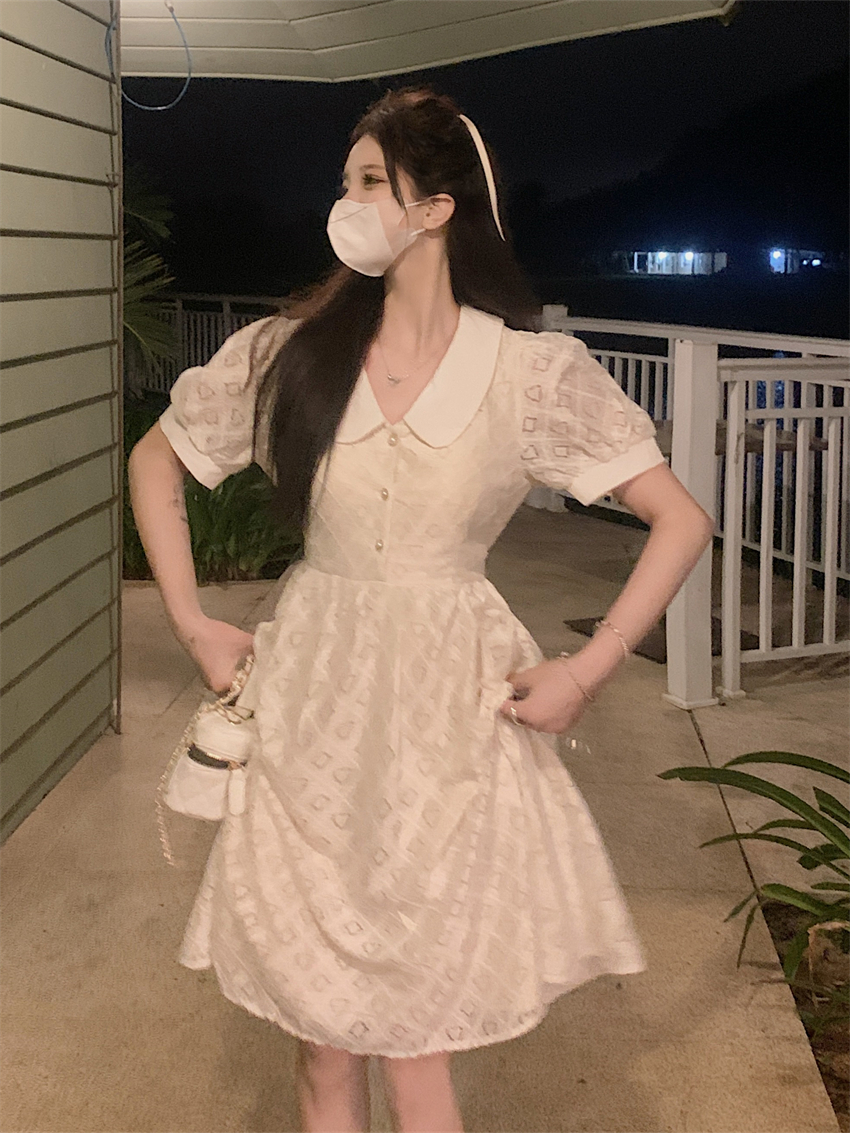 蕾丝娃娃领大摆连衣裙,面料手感很顺滑