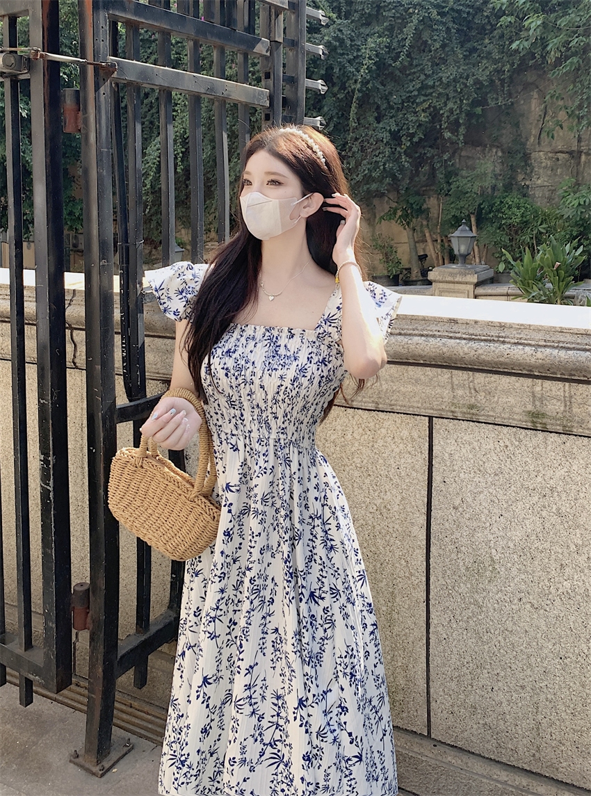 RM15193#夏季方领收腰中长款森女白色小碎花飞飞袖连衣裙子女装