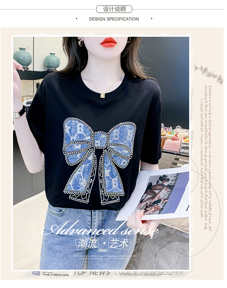 RM15310#夏季短袖圆领套头重工镶钻亮片蝴蝶结设计感小众T恤上衣女