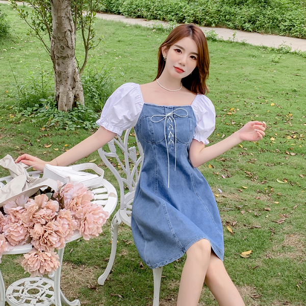 RM15324#短袖牛仔拼接淑女小清新系带小个子名媛风夏季连衣裙