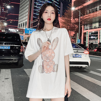 RM15390#夏季新款潮牌中长款重工烫钻短袖t恤女欧货大版欧洲站镶钻
