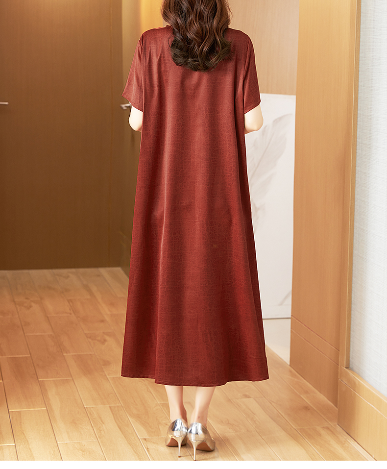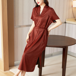RM15475#夏款中国风复古真丝红云纱女V领刺绣连衣裙子系带收腰