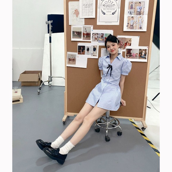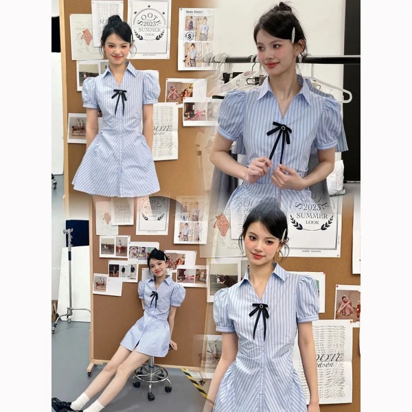 RM15488#学院风套装收腰显瘦裙子条纹衬衫连衣裙女夏季高腰短裤时尚两件套