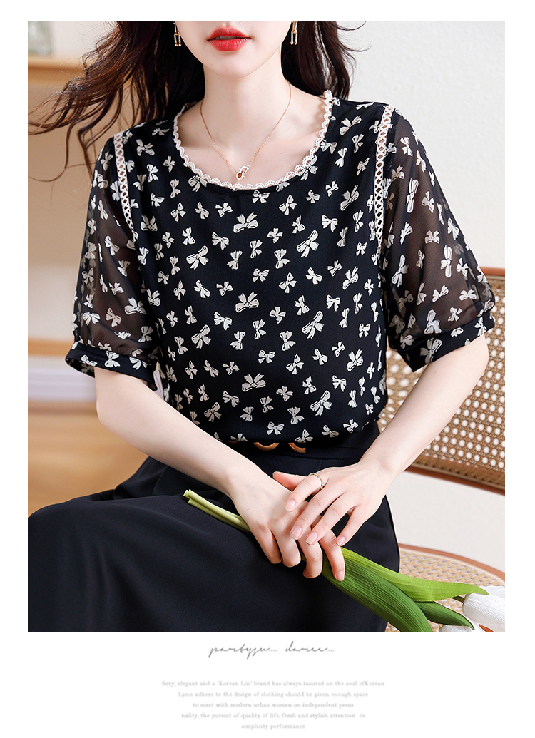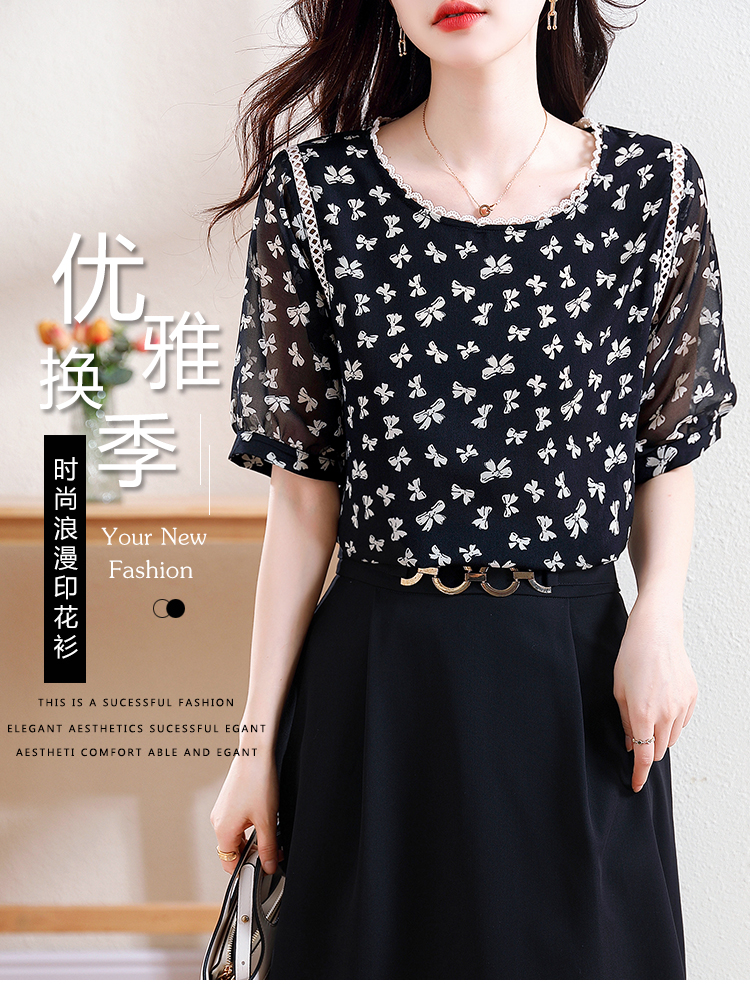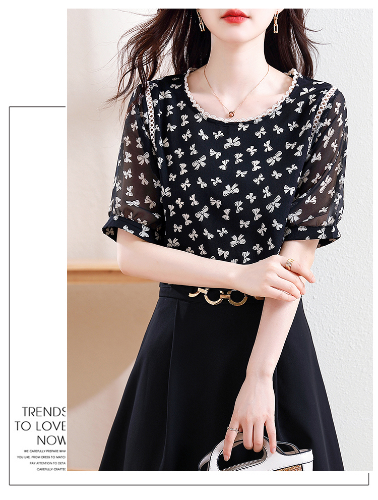 RM15595#夏季韩版小清新甜美套头圆领雪纺短袖蕾丝衫/雪纺衫